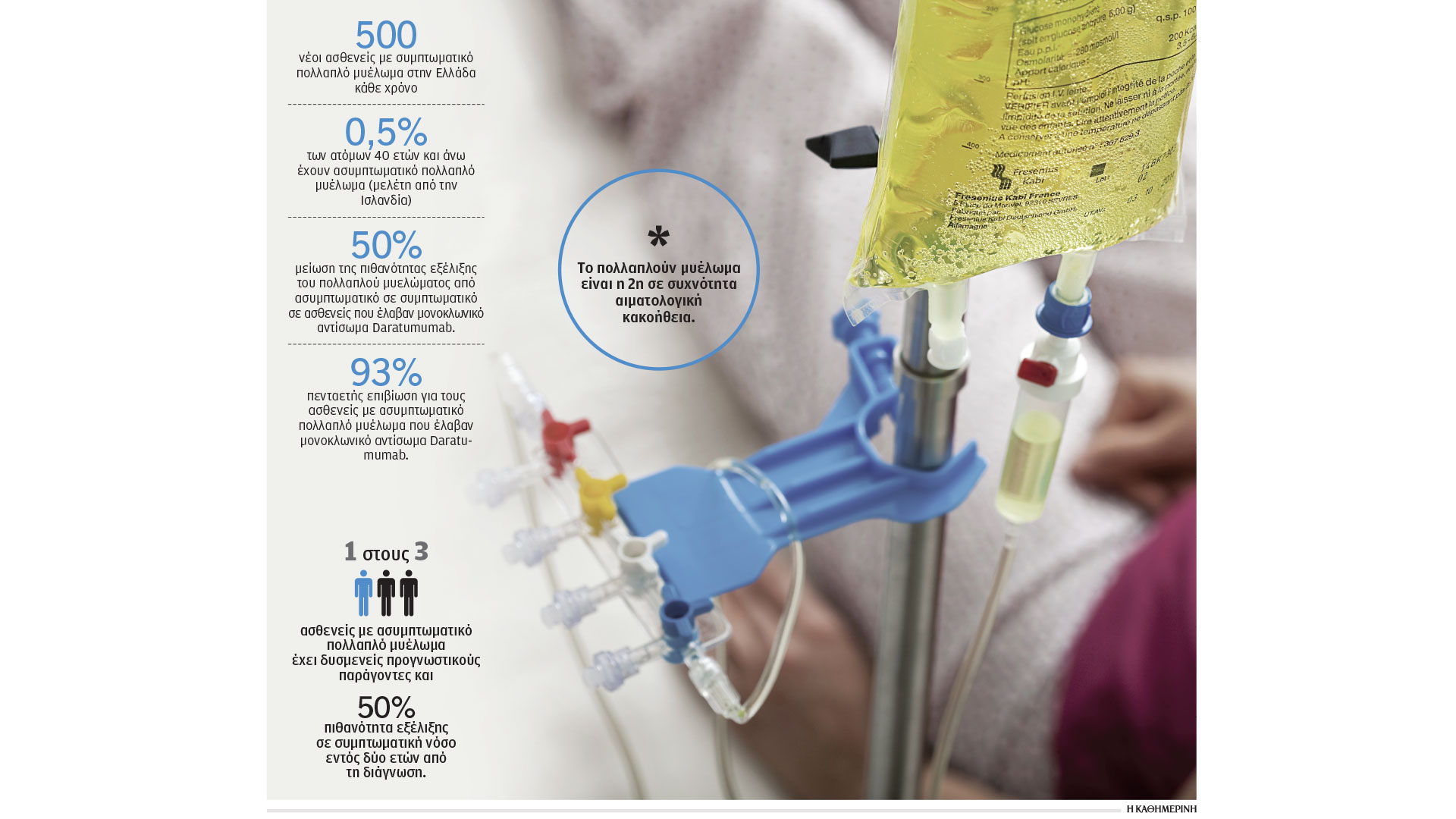 Το πολλαπλούν μυέλωμα είναι η δεύτερη πιο συχνή αιματολογική κακοήθεια. Στη χώρα μας διαγιγνώσκονται ετησίως πέντε περιπτώσεις συμπτωματικού πολλαπλού μυελώματος ανά 100.000 κατοίκους, ήτοι 500 νέοι ασθενείς που ξεκινούν θεραπεία.