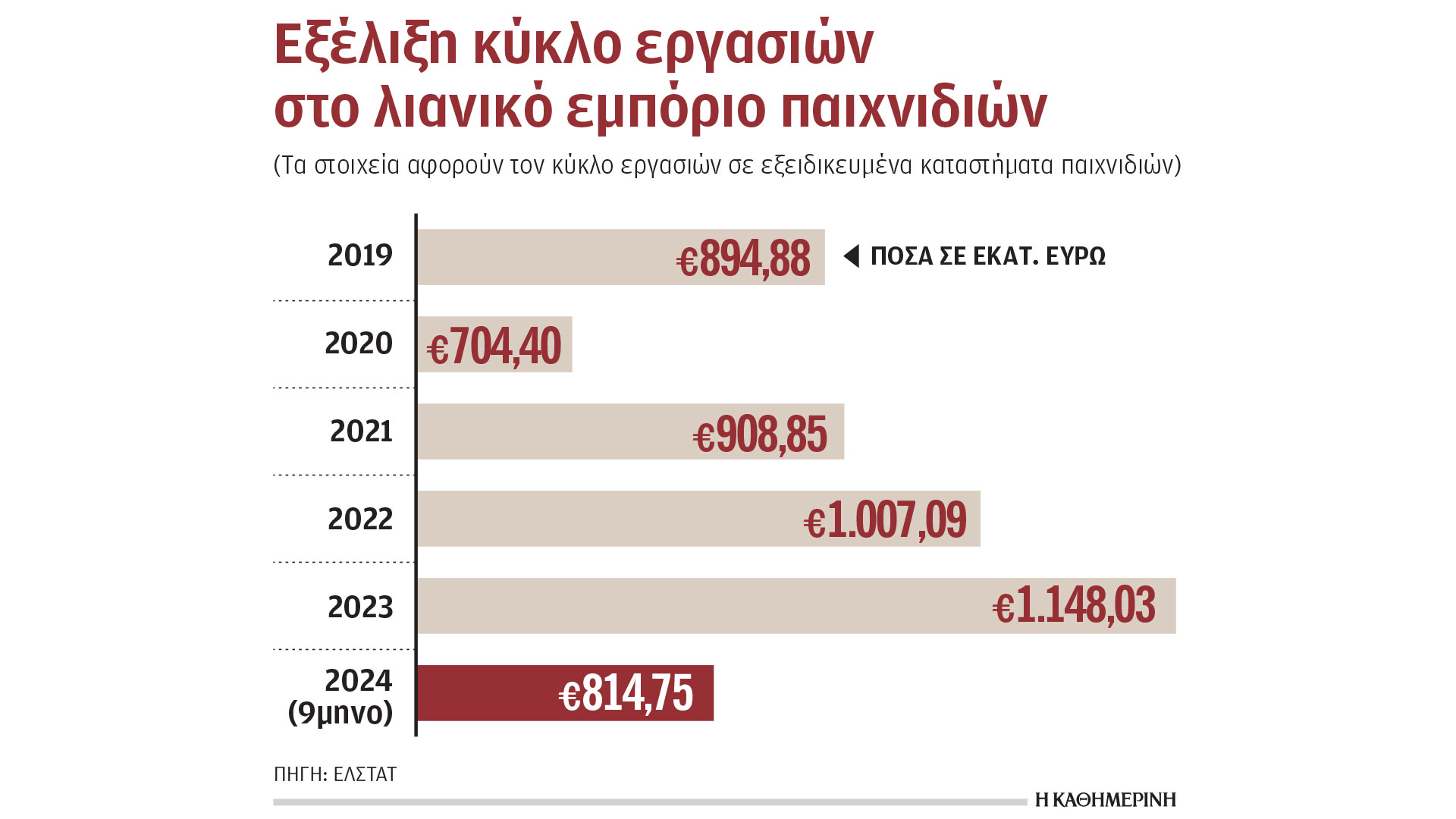 Οι παράγοντες της εν λόγω αγοράς εκτιμούν ότι, παρά την ακρίβεια, η αγορά θα κινηθεί ανοδικά, όπως συμβαίνει άλλωστε όλα τα τελευταία χρόνια, μετά την COVID-19, ειδικά μάλιστα καθώς στη συγκεκριμένη κατηγορία προϊόντων δεν έχουν γίνει μεγάλες ανατιμήσεις. Σύμφωνα με τα στοιχεία της Ελληνικής Στατιστικής Αρχής (ΕΛΣΤΑΤ) ο κύκλος εργασιών στο λιανεμπόριο παιχνιδιών διαμορφώθηκε το 2023 σε 1,15 δισ. περίπου, με τα 391 εκατ. ευρώ να γίνονται το τελευταίο τρίμηνο του έτους. Το 2022 ο τζίρος της εν λόγω κατηγορίας ήταν λίγο παραπάνω από 1 δισ. ευρώ, ενώ το 2020 και το 2021 οι πωλήσεις επηρεάστηκαν σημαντικά από το lockdown και διαμορφώθηκαν σε 704 και 908 εκατ. ευρώ, αντιστοίχως. Στα παραπάνω στοιχεία δεν περιλαμβάνονται οι πωλήσεις παιχνιδιών που γίνονται από τα σούπερ μάρκετ, τα οποία, πάντως, έχουν μικρό μερίδιο αγοράς.