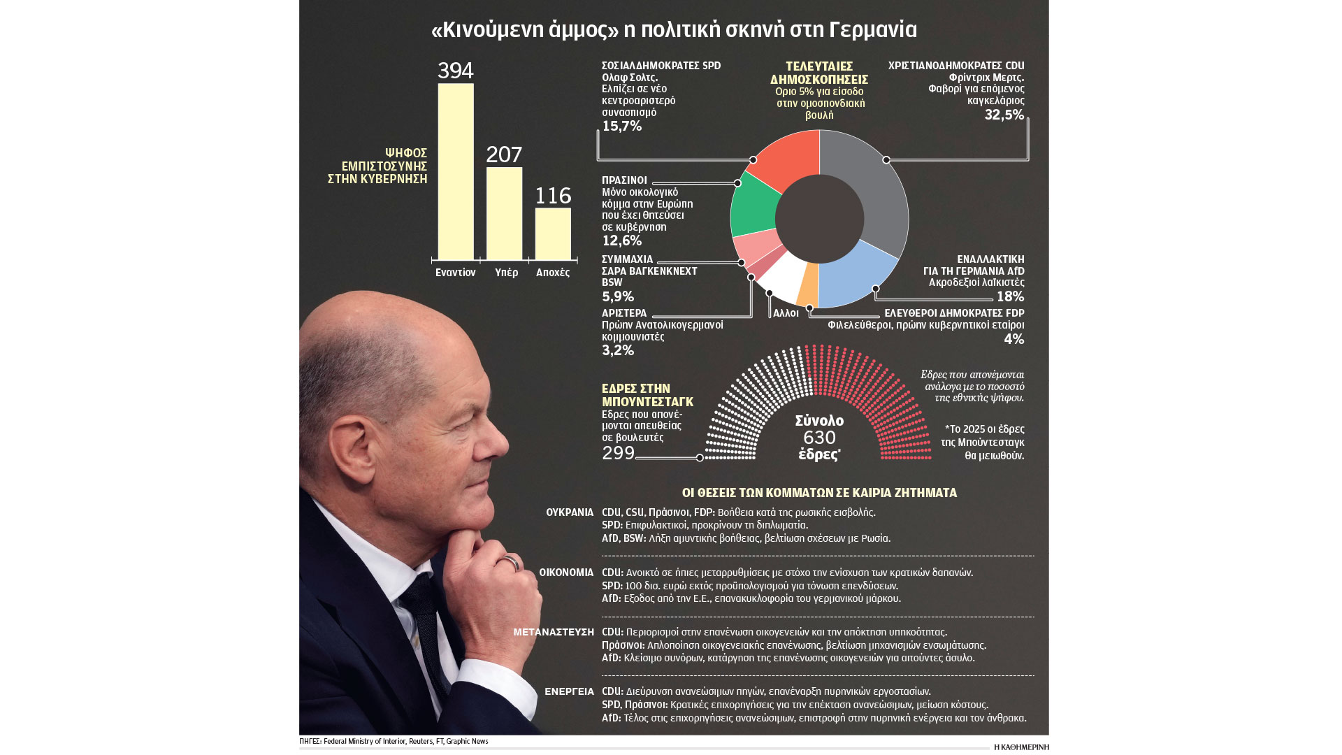 Παρά την αναιμική δημοτικότητά του και το ναυάγιο του συνασπισμού του, ο Ολαφ Σολτς πιστεύει ότι οι εκλογές θα του προσφέρουν δεύτερη θητεία. Οι δημοσκοπήσεις, όμως, εμφανίζουν τον Φρίντριχ Μερτς, ηγέτη του συντηρητικού CDU, ως επικρατέστερο νικητή των εκλογών, με 30% έως και 33% της πρόθεσης ψήφου. Δεύτερο κόμμα αναμένεται να αναδειχθεί το ακροδεξιό Εναλλακτική για τη Γερμανία (AfD) με 17% έως 19,5%. Τα υπόλοιπα κόμματα έχουν δεσμευθεί ότι δεν θα συνεργασθούν με την Ακροδεξιά.