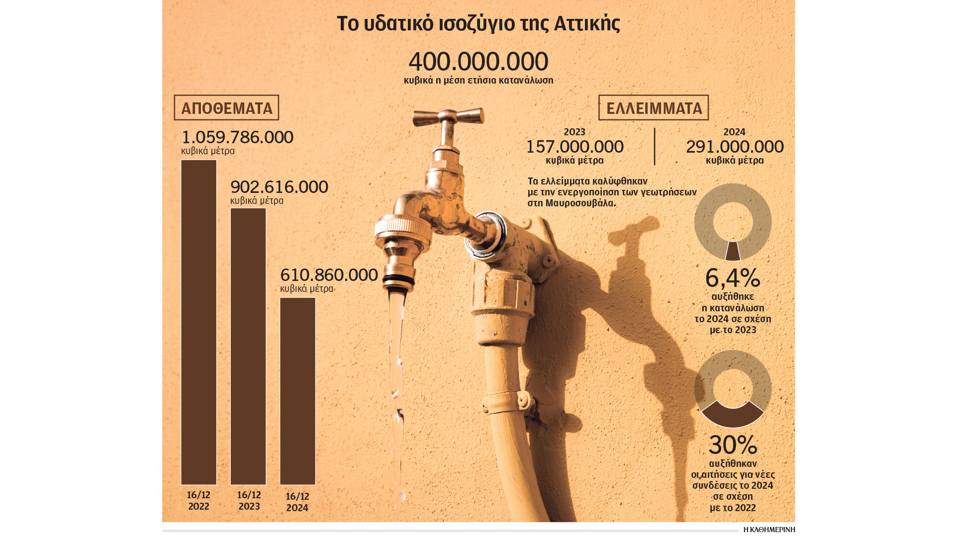 Σύμφωνα με στοιχεία που παρουσίασε χθες ο διευθύνων σύμβουλος της ΕΥΔΑΠ Χάρης Σαχίνης, η κατανάλωση νερού στην Αττική αυξήθηκε το 2024 κατά 6,4%. Και παρότι αυτό παρουσιάστηκε (και) ως θετικό γεγονός, αφού ενίσχυσε την κερδοφορία της εταιρείας, στην πραγματικότητα την προβληματίζει και σχεδιάζει νέα καμπάνια για την ευαισθητοποίηση των πολιτών. «Ελπίζουμε να χιονίσει φέτος στα βουνά της Ναυπακτίας», ανέφερε ο κ. Σαχίνης, υπενθυμίζοντας ότι το έλλειμμα νερού το 2024 ήταν 291 εκατ. κυβικά μέτρα (καλύφθηκε με την ενεργοποίηση των γεωτρήσεων της ΕΥΔΑΠ στη Μαυροσουβάλα).