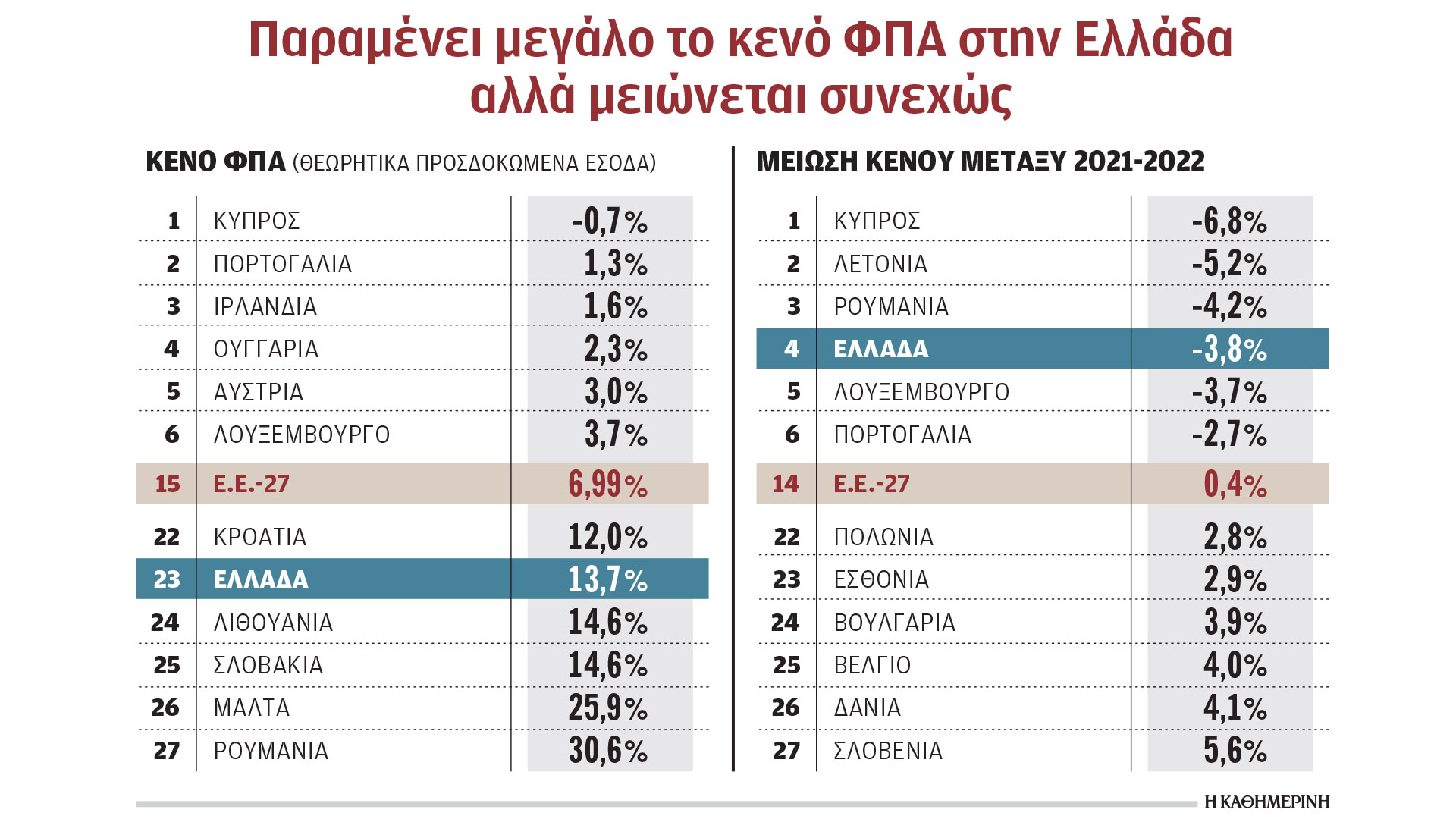 Στην Ε.Ε. το κενό ΦΠΑ υπολογίζεται σε 7% αυξημένο κατά 0,4 ποσοστιαίες μονάδες σε σύγκριση με το 2021. Η χώρα μας, παρά τη βελτίωση, κατέλαβε την 23η θέση στην Ε.Ε.