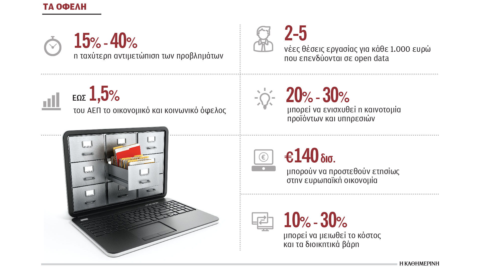 Κρυμμένο «θησαυρό» για Δημόσιο και επιχειρήσεις αποτελούν τα δεδομένα, δηλαδή σχεδόν κάθε είδους διαθέσιμη, ακατέργαστη πληροφορία (π.χ. κίνηση στους δρόμους, δημόσιες δαπάνες, προφίλ πελατών), η οποία, μέσω κατάλληλης επεξεργασίας, μπορεί να οδηγήσει σε πολύτιμα συμπεράσματα, βελτιώνοντας τη διαδικασία λήψης αποφάσεων και την επίλυση προβλημάτων. Σύμφωνα με τον Σύνδεσμο Επιχειρήσεων και Βιομηχανιών (ΣΕΒ), το 86% των επιχειρήσεων που αξιοποιούν συστηματικά τα δεδομένα τους προσαρμόζονται καλύτερα στις αλλαγές της αγοράς. Επιπλέον εξασφαλίζονται 20% μείωση του κόστους συντήρησης εξοπλισμού παραγωγής, 30% αύξηση των ταμειακών διαθεσίμων, 73% βελτίωση της απόδοσης και παραγωγικότητας των εργαζομένων, 5%-10% χαμηλότερο κόστος αποθήκευσης, και 50% συντομότερος χρόνος αναμονής εξυπηρέτησης αιτημάτων πελατών.