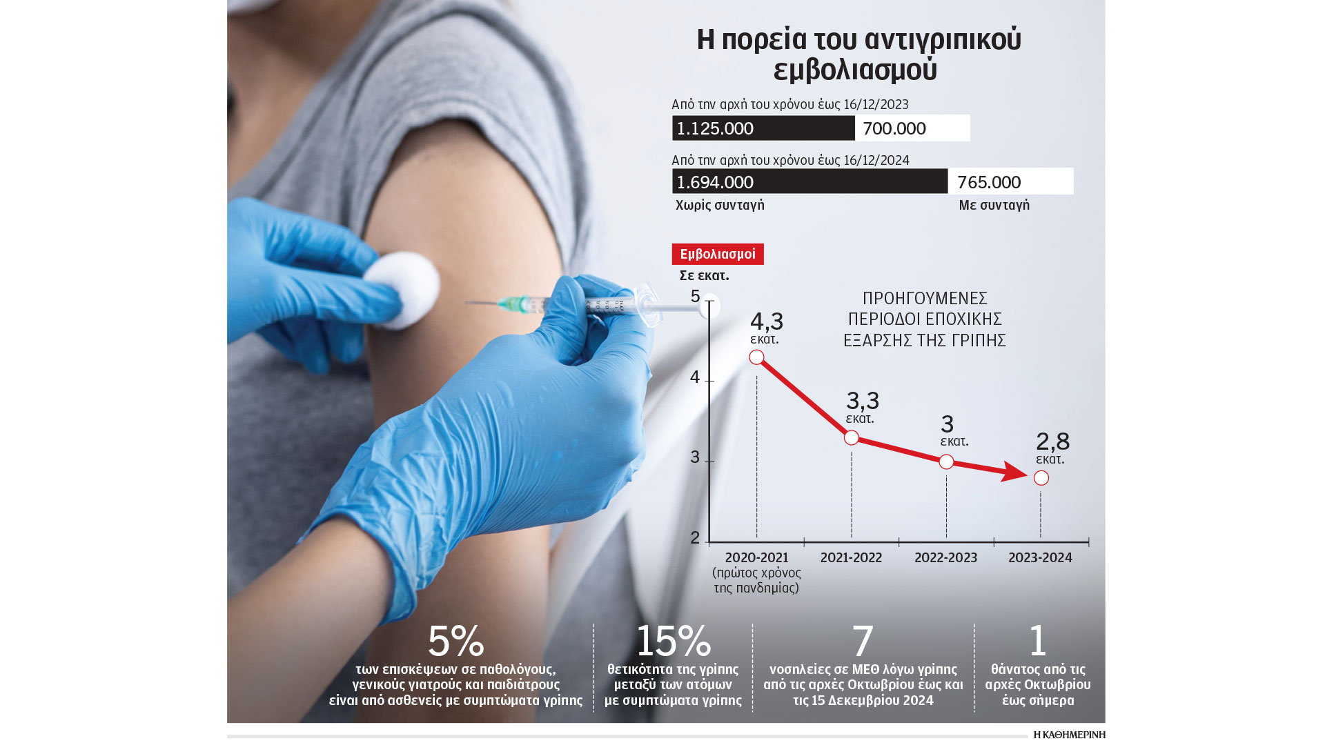 Εως τις αρχές της εβδομάδας είχαν διενεργηθεί στην Ελλάδα 1.694.000 εμβολιασμοί έναντι της γρίπης από τα φαρμακεία χωρίς ιατρική συνταγή, ενώ είχαν συνταγογραφηθεί 765.000 αντιγριπικά εμβόλια. Συνολικά φέτος έχουν γίνει μέχρι τώρα περίπου 600.000 περισσότεροι εμβολιασμοί, αφού πέρυσι την ίδια περίοδο είχαν διενεργηθεί 1.125.000 εμβολιασμοί χωρίς συνταγή και είχαν συνταγογραφηθεί 700.000 αντιγριπικά εμβόλια. «Πάμε πολύ καλύτερα σε σχέση με πέρυσι», ανέφερε στην «Κ» ο πρόεδρος του Πανελλήνιου Φαρμακευτικού Συλλόγου Απόστολος Βαλτάς. Σύμφωνα με τον ίδιο, στις καλύτερες επιδόσεις βοήθησε το ότι φέτος επιτράπηκε η πραγματοποίηση του εμβολίου χωρίς συνταγή, κάτι που πέρυσι καθυστέρησε για τουλάχιστον ένα μήνα. «Ο πολίτης έχει συνυφασμένο στο μυαλό του τον αντιγριπικό εμβολιασμό με το φαρμακείο. Το γεγονός ότι φέτος από την αρχή το εμβόλιο χορηγείται στα φαρμακεία χωρίς ιατρική συνταγή βοήθησε στο να εμβολιαστούν περισσότεροι», σημειώνει ο κ. Βαλτάς.