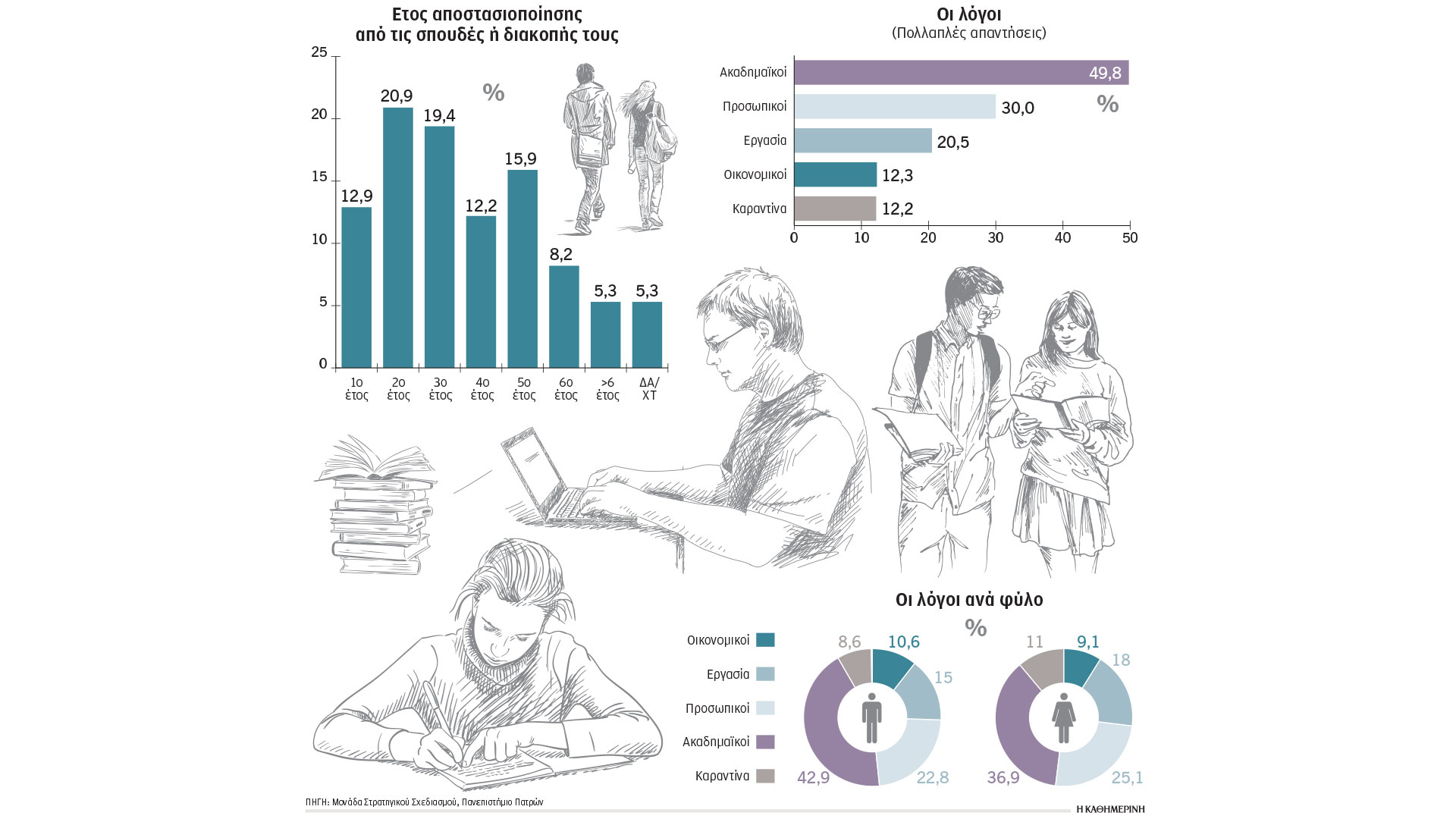 Μεταξύ των βασικών λόγων για τους οποίους ένας φοιτητής παρατάει τις σπουδές του –εκτός από τυχόν οικονομικές δυσκολίες, που ωστόσο δεν είναι κυρίαρχος λόγος– είναι οι εξής πέντε: