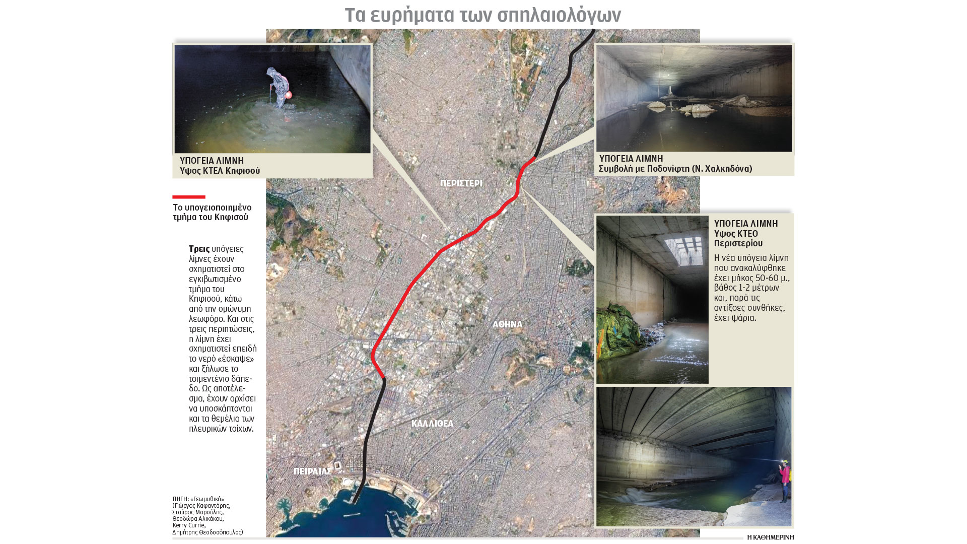 Εχοντας «ανακαλύψει» ακόμη δύο λίμνες στην υπόγεια κοίτη του Κηφισού, η ομάδα των σπηλαιολόγων της «Γεωμυθικής» εκτιμά πως η κατάσταση είναι χειρότερη από ό,τι πιστεύουμε. «Θα ετοιμάσουμε και θα στείλουμε μια τεχνική έκθεση στην Περιφέρεια Αττικής, στην οποία και ανήκει η υπόγεια κοίτη. Το θετικό είναι ότι έδειξε ενδιαφέρον και απομάκρυνε μεγάλο μέρος των μπάζων και των σκουπιδιών που είχαν με τα χρόνια συσσωρευθεί. Ηταν η πρώτη παρέμβαση μετά πολλά χρόνια, όμως χρειάζονται περισσότερα. Το ζήτημα της στατικότητας είναι πολύ σοβαρό και κατά τη γνώμη μας χρειάζεται να αντληθούν τα νερά και να γίνει μια εκτίμηση των ζημιών από μηχανικούς. Ο υπόγειος αγωγός σε αυτή την τρίτη λίμνη είναι στη χειρότερη κατάσταση που έχουμε δει», εξηγεί ο κ. Θεοδοσόπουλος. «Και να σημειώσω ότι δεν έχουμε καθόλου εικόνα για το ποια είναι η κατάσταση σε ακόμη 2 χλμ. υπόγειας κοίτης, από αυτήν την τελευταία λίμνη έως τη συμβολή του Κηφισού με τη λεωφόρο Αθηνών. Μπορεί τα πράγματα να είναι χειρότερα».