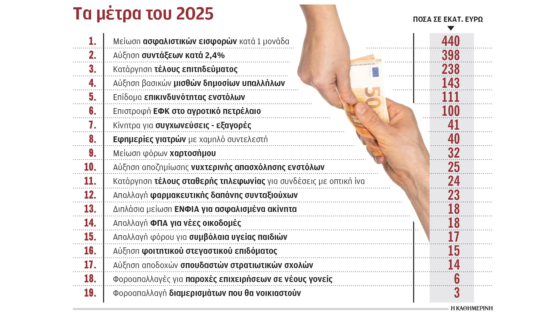 Στο 1,5 δισ. ευρώ έφτασαν τελικά τα μέτρα του 2025 για την ενίσχυση του εισοδήματος και τις μειώσεις φόρων, μετά τις τελευταίες «προσθήκες» που έκανε ο πρωθυπουργός Κυρ. Μητσοτάκης κατά τη συζήτηση του προϋπολογισμού για το επίδομα επικινδυνότητας των ενστόλων και την απαλλαγή συμμετοχής στη φαρμακευτική δαπάνη των συνταξιούχων πρώην δικαιούχων του ΕΚΑΣ.