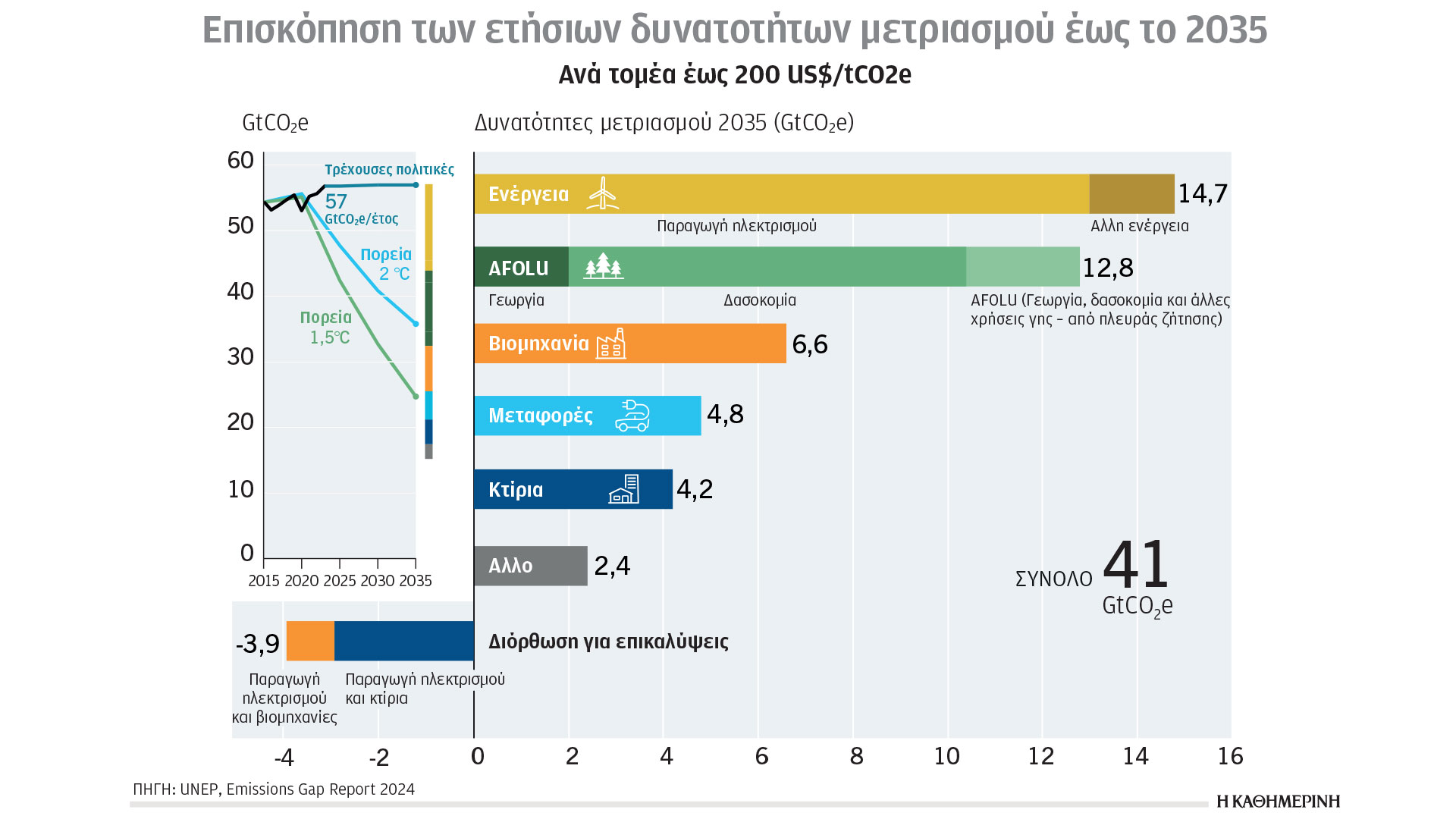 Για επίτευξη του 1,5 °C απαιτούνται επενδύσεις για μετριασμό πολλές φορές περισσότερες από τα σημερινά δεδομένα, διαφορετικά οδεύουμε προς αύξηση θερμοκρασίας της τάξης των 2,6 °C – 3,1 °C. Την τελευταία δεκαετία οι επενδύσεις για το κλίμα, συμπεριλαμβανομένου του μετριασμού και της προσαρμογής, έχουν αυξηθεί, φτάνοντας στο 1,3 τρισ. δολ. ετησίως το 2021-2022, με το 1,2 τρισ. να αφορά τον μετριασμό. Οι ετήσιες επενδύσεις μετριασμού πρέπει να αυξηθούν τουλάχιστον έξι φορές από τα σημερινά επίπεδα για να φτάσουν κατά μέσον όρο τα 9,1 τρισ. δολ. το 2035. Οι μεγαλύτερες ανάγκες επένδυσης αφορούν τον τομέα της δασοκομίας και της γεωργίας (171-198 φορές περισσότερες) και της βιομηχανίας (109-145 φορές περισσότερες).