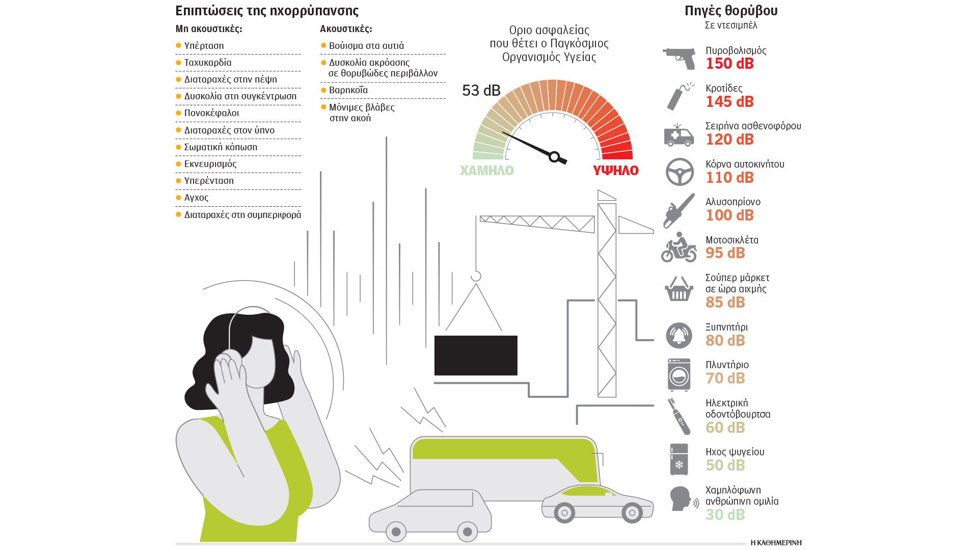 Σε περίπτωση που ένας άνθρωπος εκτεθεί για τέσσερις ώρες σε ήχο που προέρχεται από μοτοσικλέτα (95 ντεσιμπέλ) διατρέχει κίνδυνο μόνιμης βλάβης στην ακοή του, από ακρόαση μουσικής με ακουστικά σε υπερβολικά υψηλή ένταση σε δύο ώρες, ενώ από απογείωση αεροπλάνου (140 ντεσιμπέλ) η ζημιά μπορεί να είναι ακαριαία. Οι κάτοικοι της Αθήνας σίγουρα ενοχλούνται από ποικίλους θορύβους καθημερινά. Τρένα, εργοτάξια, οικοδομές, υπαίθριες αγορές, κυκλοφορία στον δρόμο και πολλά άλλα. Υπάρχει όμως και μια άλλη διάσταση, την οποία δεν έχουν συνειδητοποιήσει πολλοί: η ηχορρύπανση μας αρρωσταίνει. Εκτός από τις επιδράσεις στα αυτιά μας, δηλαδή την υπερευαισθησία ή την ελάττωση της ακουστικής ικανότητας, υπάρχουν και οι μη ακουστικές συνέπειες, που επηρεάζουν τη γενικότερη λειτουργία του οργανισμού: ο θόρυβος προκαλεί αύξηση παραγωγής διαφόρων επιβλαβών ορμονών, διαστολή της κόρης των οφθαλμών, μέχρι κίνηση του στομάχου και του υπογαστρίου. Κυρίως ευθύνεται για την πρόκληση καρδιαγγειακών βλαβών: έμφραγμα του μυοκαρδίου, στεφανιαία νόσο και αρτηριακή υπέρταση, λόγω της αύξησης των επιπέδων της κορτιζόλης, γνωστής και ως «ορμόνης του στρες». Ο Παγκόσμιος Οργανισμός Υγείας τοποθετεί την ηχορρύπανση στη δεύτερη θέση –στην πρώτη βρίσκεται η ατμοσφαιρική ρύπανση– στην κατάταξη των μεγαλύτερων περιβαλλοντικών κινδύνων για την υγεία.