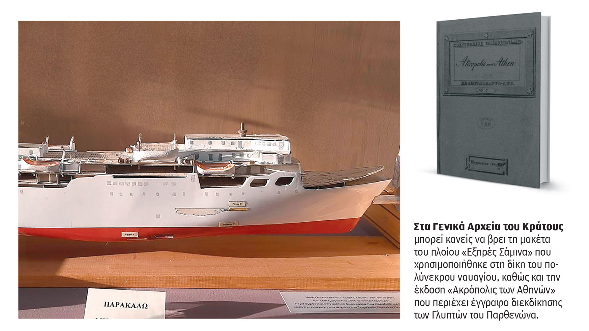 Το ίδιο σημαντικά αποδεικνύονται τα ΓΑΚ στη διεκδίκηση της επιστροφής των Γλυπτών του Παρθενώνα. Η προσπάθεια αυτή αποτυπώνεται στο αρχειακό υλικό που διασώζεται στην Κεντρική Υπηρεσία των Αρχείων, αλλά και στην έκδοση των ΓΑΚ «Ακρόπολις των Αθηνών». Η έκδοση αποτελείται από υλικό του σχετικού φακέλου του αρχείου: «Ανάκτορα: Γραμματεία Εκκλησιαστικών και Παιδείας». Τα έγγραφα του φακέλου καλύπτουν την περίοδο από το 1834 έως το 1842 και αναδεικνύουν την οργανωμένη προσπάθεια του ελληνικού κρατικού μηχανισμού και της ελληνικής διπλωματίας για την επιστροφή των Γλυπτών ήδη από τις απαρχές του ελληνικού κράτους.