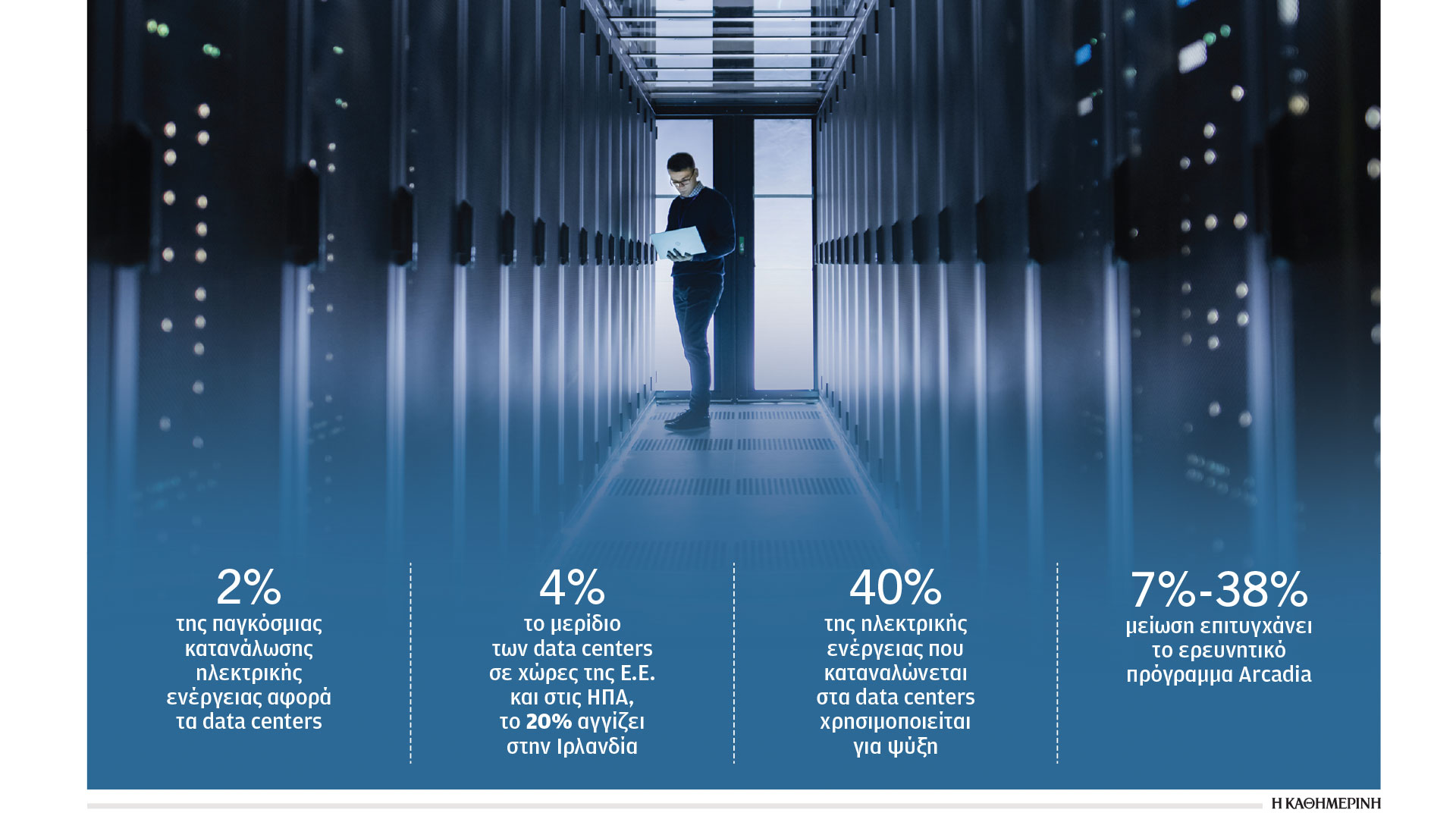 Η ραγδαία ανάπτυξη νέων εφαρμογών της τεχνητής νοημοσύνης, του Διαδικτύου των πραγμάτων και της επιστήμης των δεδομένων σε ολοένα και περισσότερους τομείς απαιτεί τη χρήση τεράστιων υπολογιστικών πόρων σε κέντρα δεδομένων (data centers), που ενσωματώνουν στη λειτουργία τους σύνθετους υπολογιστικά και ενεργοβόρους αλγορίθμους τεχνητής νοημοσύνης. Το ενεργειακό αποτύπωμα των σύγχρονων κέντρων δεδομένων έχει αυξηθεί σημαντικά τα τελευταία χρόνια, φτάνοντας περίπου στο 2% της παγκόσμιας κατανάλωσης ηλεκτρικής ενέργειας, ενώ ήδη είναι στο 4% σε χώρες της Ε.Ε. και στις ΗΠΑ, με την Ιρλανδία που φιλοξενεί πολλά data centers να φτάνει στο 20%. Εκτιμήσεις υπολογίζουν ότι πολύ σύντομα, το 2026, το μερίδιο αυτό θα διπλασιαστεί, ενώ στο κοντινό μέλλον αναμένεται ακόμα πιο μεγάλη άνοδος των ενεργειακών απαιτήσεων. Πώς θα μπορούσε να υπάρχουν βιώσιμα data centers; Πώς μπορεί να μειωθεί η κατανάλωση ενέργειας; Ενα έργο του ερευνητικού κέντρου «Αθηνά» έρχεται να δώσει απαντήσεις, με σύγχρονες εφαρμογές με χρήση τεχνητής νοημοσύνης, που μειώνουν τη δέσμευση υπολογιστικών συστημάτων από 7% έως και 38% σε περιόδους αιχμής, με συνέπεια ανάλογη εξοικονόμηση ενέργειας.
