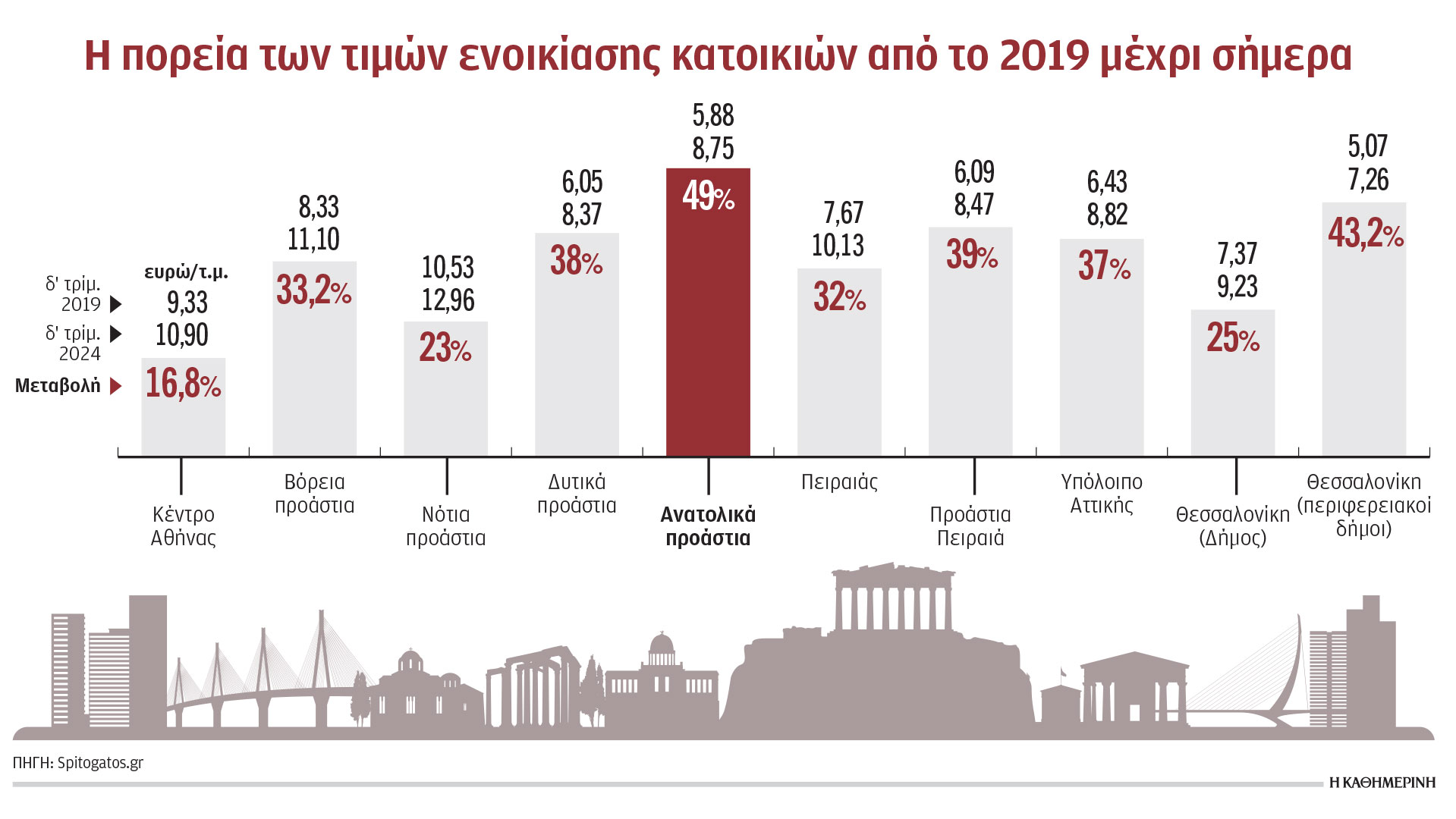 Εν τω μεταξύ, το κόστος στέγασης συνεχίζει την ανοδική πορεία του. Σύμφωνα με τα στοιχεία της ψηφιακής πλατφόρμας αγγελιών Spitogatos, κατά την εξαετία 2019-2024 και παρά τη μεσολάβηση της πανδημίας, που ανέκοψε για περίπου 18 μήνες την αύξηση των ενοικίων, καταγράφονται αυξήσεις έως 49% (ανατολικά προάστια της Αττικής). Στο κέντρο της Αθήνας η αύξηση της μέσης ζητούμενης τιμής ενοικίασης διαμορφώνεται σε 16,8%, ποσοστό που δεν φαντάζει μεγάλο, αλλά αυτό οφείλεται στο ότι οι μεγάλες αυξήσεις πραγματοποιήθηκαν ήδη από τη διετία 2017-2018. Ακόμη κι έτσι, απαιτούνται πλέον περί τα 1.000 ευρώ για τη μίσθωση 100-110 τ.μ. στο κέντρο ή περίπου 700-800 ευρώ για ένα σπίτι 80 τ.μ. Μεγάλες αυξήσεις καταγράφονται επίσης στα δυτικά προάστια με 38%, από τα 6 ευρώ/τ.μ. σε 8,37 ευρώ/τ.μ., ενώ στα βόρεια προάστια η αύξηση της περιόδου 2019-2024 διαμορφώνεται σε 33,2%, από τα 8,33 ευρώ/τ.μ. στα 11,1 ευρώ/τ.μ.
