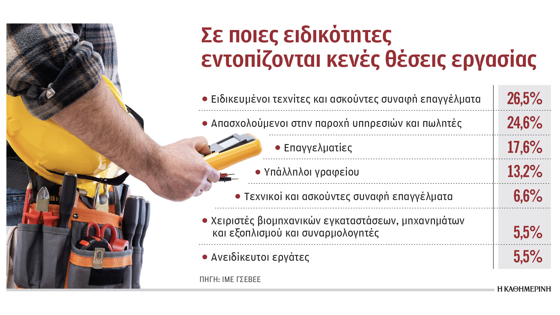 Την προηγούμενη δεκαετία, τη δεκαετία της κρίσης, οι άνθρωποι ήθελαν να δουλέψουν, αλλά δεν έβρισκαν δουλειά. Την τρέχουσα δεκαετία υπάρχουν θέσεις εργασίας, όμως αυτές μένουν κενές και μάλιστα όχι σε έναν κλάδο, αλλά σε πολλούς, από προγραμματιστές μέχρι οικοδόμους. Το ακόμη πιο ενδιαφέρον είναι ότι σε δυσχερή θέση –από την πλευρά των εργαζομένων– βρίσκονται τόσο αυτοί που έχουν πολύ λίγες δεξιότητες όσο και εκείνοι που έχουν υπερβολικά πολλές, οι λεγόμενοι και «υπερπροσοντούχοι», καθώς δεν προτιμώνται, αφού οι εργοδότες θεωρούν ότι δεν μπορούν να τους προσφέρουν την αμοιβή που τους αναλογεί και ότι στην πραγματικότητα θα προσλάβουν κάποιον συμβιβασμένο και χωρίς ενθουσιασμό για τη δουλειά του υπάλληλο. Πάντως και στην περίπτωση που οι εργοδότες θεωρούν ότι οι εργαζόμενοι έχουν λίγες δεξιότητες, δεν φαίνεται να κάνουν και πολλά, καθώς οι μισές επιχειρήσεις δεν εφαρμόζουν προγράμματα εκπαίδευσης και κατάρτισης. Τα συμπεράσματα αυτά προκύπτουν μεταξύ άλλων από τη μελέτη «Ποιες δεξιότητες αναζητούν οι επιχειρήσεις» που υλοποίησε το Ινστιτούτο Μικρών Επιχειρήσεων της Γενικής Συνομοσπονδίας Επαγγελματιών Βιοτεχνών Εμπόρων Ελλάδας (ΙΜΕ ΓΣΕΒΕΕ) σε συνεργασία με την εταιρεία ερευνών γνώμης GPO.
