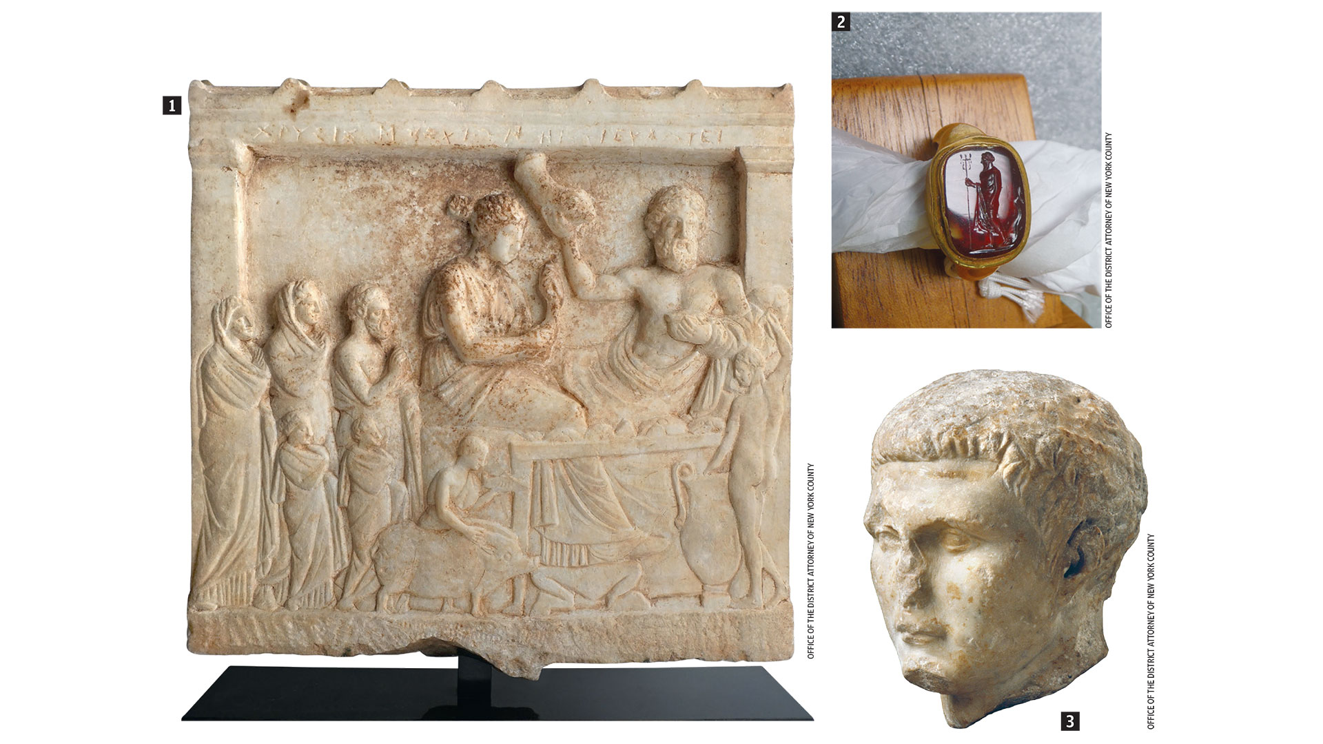 Από τις έντεκα αρχαιότητες, εκείνη με την υψηλότερη οικονομική αξία φαίνεται πως είναι το μαρμάρινο ταφικό ανάγλυφο, το οποίο έχει διαστάσεις 44,5 εκ. επί 44,8 εκ. και εκτιμάται γύρω στις 500.000 δολάρια. Μια πρώτη αναζήτηση της «Κ» σε σχετικά επιστημονικά δημοσιεύματα εντόπισε μια εκτενή αναφορά για το ανάγλυφο σε άρθρο της ιστορικού Τέχνης Χόλι Μαρί Μίλερ (Πανεπιστήμιο του Μέριλαντ), η οποία σημειώνει ότι το συγκεκριμένο γλυπτό έργο, προϊόν αθηναϊκού εργαστηρίου, απεικονίζει τον νεκρό σε σκηνή συμποσίου και στο παρελθόν έχει συνδεθεί με μουσείο που βρίσκεται στην πολιτεία του Τενεσί.