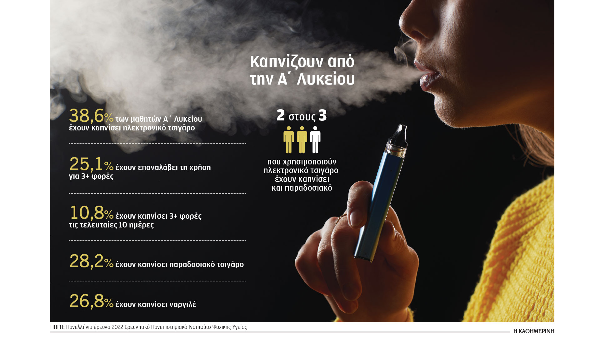 Η εικόνα της μεγάλης διείσδυσης των νέων καπνικών προϊόντων στις μικρές ηλικίες αναδείχθηκε από τη μεγάλη πανελλαδική έρευνα του Ερευνητικού Πανεπιστημιακού Ινστιτούτου Ψυχικής Υγείας (ΕΠΙΨΥ), σε αντιπροσωπευτικό δείγμα 6.250 μαθητών το 2022 (πραγματοποιείται κάθε τέσσερα χρόνια). Σύμφωνα με αυτή, στην Α΄ Λυκείου ήδη το 38,6% των μαθητών και των μαθητριών έχει καπνίσει ηλεκτρονικό τσιγάρο, ενώ το 25,1% έχει επαναλάβει τη χρήση για πάνω από τρεις φορές. Μάλιστα, το 10,8% φαίνεται να έχει πλέον αποκτήσει πιο σταθερή σχέση με το vape του, καθώς έχει ατμίσει πάνω από τρεις φορές τις προηγούμενες 10 ημέρες. Ανάγλυφα φαίνεται η άνοδος της χρήσης ηλεκτρονικού τσιγάρου, καθώς το 2014 –στην ίδια έρευνα– μόνο το 16,6% είχε δοκιμάσει, για να απογειωθεί στο 36,7% το 2018. Δυναμώνει όμως και η συχνή χρήση: Από 6,6% το 2018 ανήλθε στο 10,7% το 2022, το ποσοστό όσων έχουν καπνίσει ηλεκτρονικό τσιγάρο πάνω από τρεις φορές τον τελευταίο μήνα.