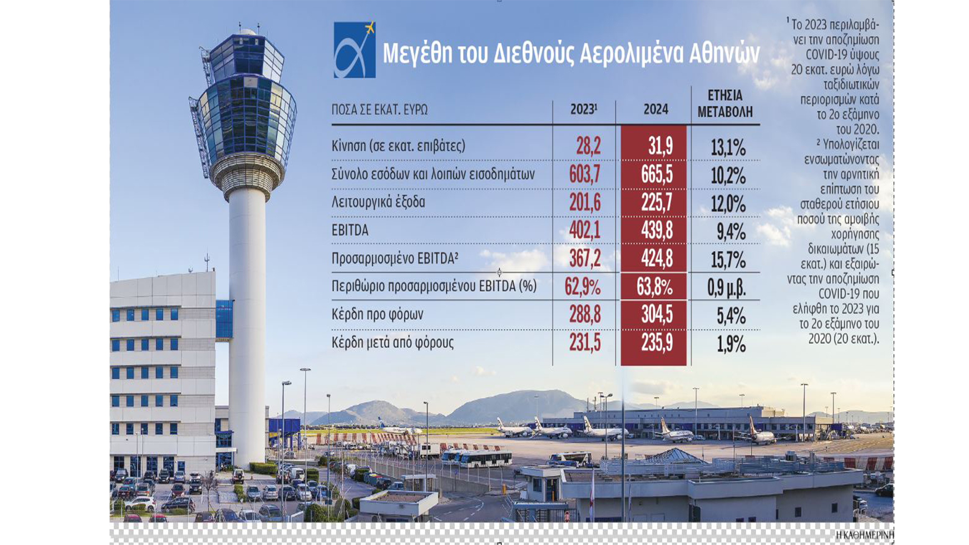 Την επιτάχυνση του επενδυτικού προγράμματος για την αύξηση της δυναμικότητας του αεροδρομίου «Ελευθέριος Βενιζέλος» στα Σπάτα ανακοίνωσε η εισηγμένη παραχωρησιούχος «Διεθνής Αερολιμένας Αθηνών». Η εταιρεία διαχείρισης του μεγαλύτερου αεροδρομίου της χώρας κατά τη χρήση του 2024 σημείωσε αύξηση κύκλου εργασιών 10,2%, στα 665,5 εκατ. ευρώ από 603,7 εκατ. ευρώ το 2023, προσαρμοσμένα κέρδη EBITDA 424,8 εκατ. αυξημένα κατά 15,7% και κέρδη μετά από φόρους ύψους 235,9 εκατ. (+1,9%). Περαιτέρω ανάπτυξη της επιβατικής κίνησης, με μονοψήφιο ποσοστό ανόδου, αναμένεται και το 2025. Σύμφωνα με το management της εταιρείας, στη βελτίωση των οικονομικών αποτελεσμάτων της πέρυσι συνέβαλαν τόσο η αύξηση της επιβατικής κίνησης κατά 13,1% όσο και η βελτίωση της εμπορικής εκμετάλλευσης. Ετσι η διοίκηση θα προτείνει στη γενική συνέλευση των μετόχων τη διανομή του συνόλου των καθαρών κερδών του 2024, που αντιστοιχεί σε μεικτό μέρισμα 0,78 ευρώ ανά μετοχή.