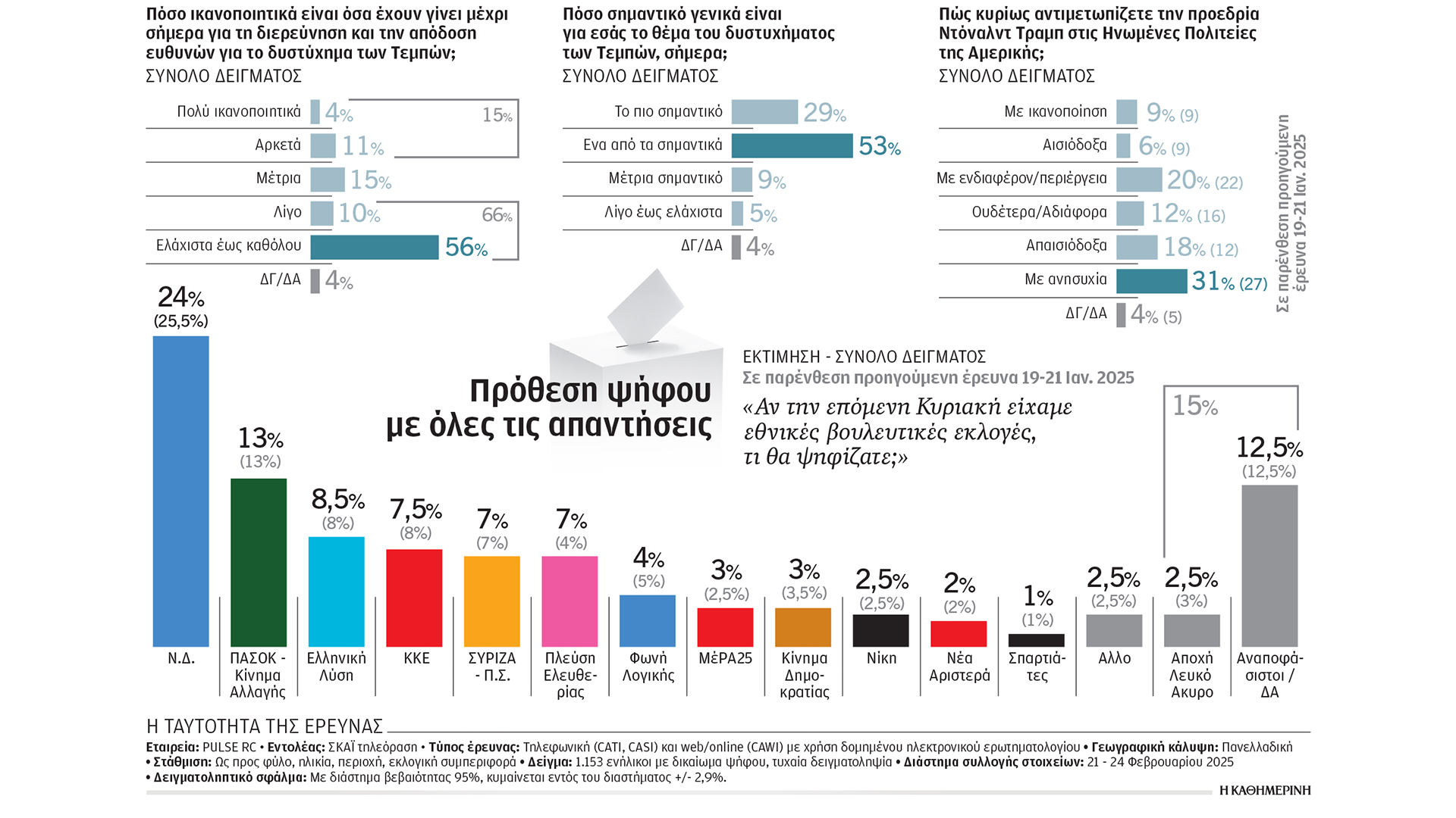 Το αυριανό συλλαλητήριο για τα Τέμπη, οι κατηγορίες της αντιπολίτευσης προς την κυβέρνηση περί συγκάλυψης, καθώς και η αντεπίθεση του Μαξίμου για εργαλειοποίηση του δυστυχήματος κυριαρχούν στο πολιτικό σκηνικό και αποτυπώνονται με τον πιο ξεκάθαρο τρόπο στη δημοσκόπηση της Pulse που παρουσιάστηκε στο κεντρικό δελτίο ειδήσεων του ΣΚΑΪ.