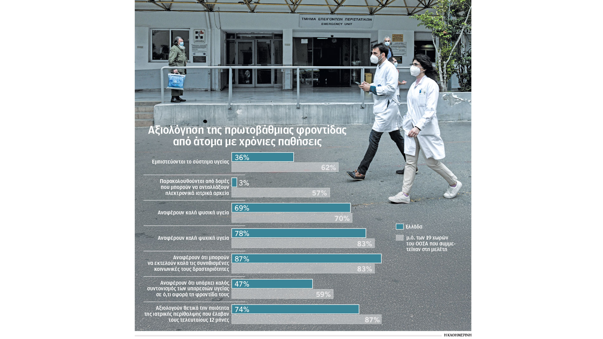Οι άνθρωποι που έχουν περισσότερο και διαρκώς ανάγκη το σύστημα υγείας έχουν χαμηλή εμπιστοσύνη σε αυτό. Αυτό το έλλειμμα καταδεικνύει έρευνα, η οποία διεξήχθη στο πλαίσιο του διακρατικού προγράμματος PaRIS του ΟΟΣΑ: Μόλις το 36% των Ελλήνων με χρόνιες παθήσεις δηλώνουν ότι εμπιστεύονται το ΕΣΥ, ποσοστό που είναι το χαμηλότερο μεταξύ των 19 χωρών που συμμετείχαν στη μελέτη, όπου ο μέσος όρος είναι 62%. Αιτίες; Η συνέχεια στη φροντίδα δεν διασφαλίζεται, δεν υπάρχει συντονισμός των παρεχόμενων υπηρεσιών και το σημαντικό εργαλείο του ηλεκτρονικού φακέλου υγείας δεν αξιοποιείται. Στην Ελλάδα, λιγότεροι από τους μισούς (47%) αισθάνονται ότι υπάρχει καλός συντονισμός των υπηρεσιών για τη φροντίδα τους, ενώ μόνο ένα στα τέσσερα (24%) άτομα με δύο ή και περισσότερες χρόνιες παθήσεις δηλώνει ότι έχει συστηματική και επαρκή παρακολούθηση. Και μόλις το 3% των πασχόντων παρακολουθείται από δομές που είναι σε θέση να ανταλλάσσουν ηλεκτρονικά ιατρικούς φακέλους, όταν το μέσο ποσοστό στις χώρες που συμμετέχουν στη μελέτη είναι 57%.