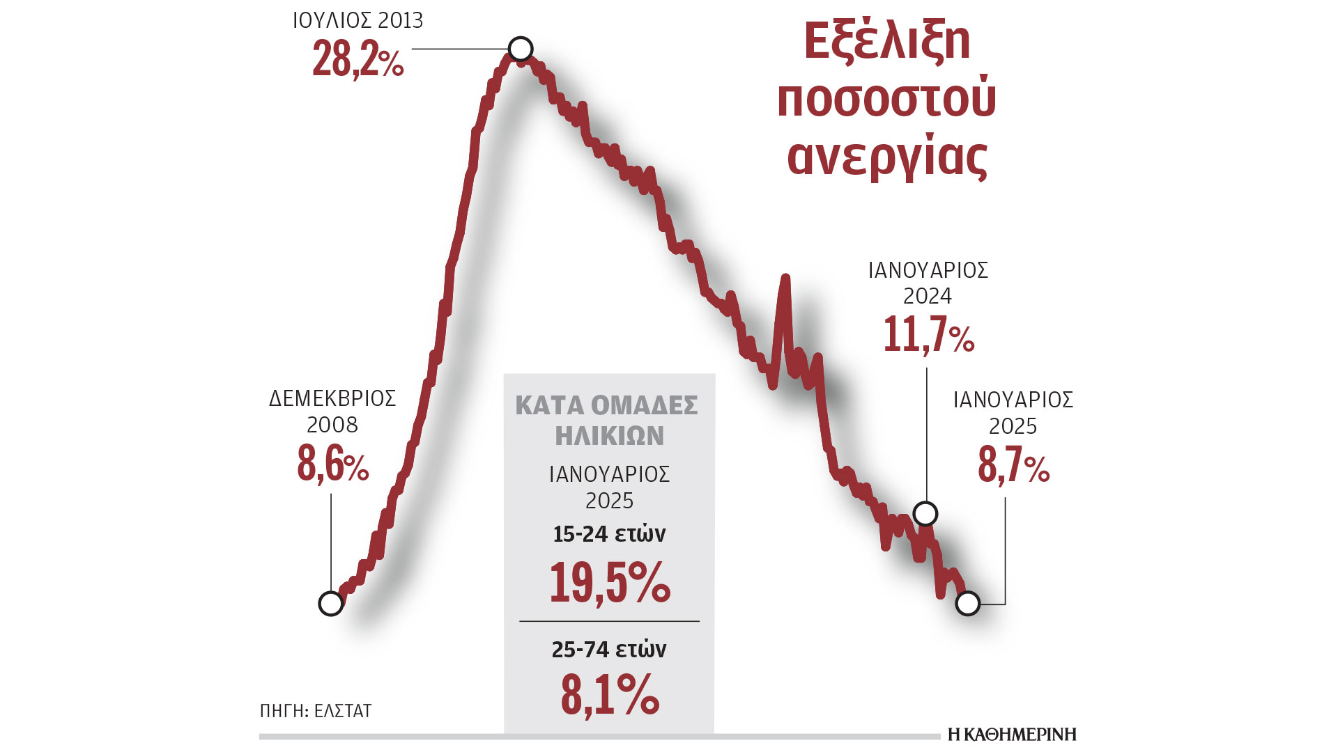Αναλυτικά, τα στοιχεία της ΕΛΣΤΑΤ δείχνουν πως μετά τον Ιούνιο του 2024, όταν είχε υποχωρήσει στο 8,9%, το φράγμα του 9% σπάει για δεύτερη φορά μέσα σε ένα χρόνο, φθάνοντας το 8,7%. Σε αυτά τα επίπεδα είχε να φτάσει από τον Δεκέμβριο του 2008, όταν είχε υπολογιστεί σε 8,6%. Ετσι, διαπιστώνεται υποχώρηση κατά τρεις ποσοστιαίες μονάδες σε σχέση με το 11,7% του Ιανουαρίου 2024, αλλά και κατά 0,6 μονάδες συγκριτικά με το 9,3% του περασμένου Δεκεμβρίου. Ο αριθμός των ανέργων περιορίστηκε στους 408.181, μειωμένος κατά 149.257 συγκριτικά με τον Ιανουάριο του 2024 (-26,8%), αλλά και κατά 28.330 άτομα σε σχέση με τον αμέσως προηγούμενο μήνα – τον Δεκέμβριο του προηγουμένου έτους. Αύξηση παρατηρείται και στον αριθμό των απασχολουμένων τον Ιανουάριο, καθώς ανήλθαν στα 4,288 εκατ. άτομα, περισσότεροι κατά 61.559 σε σχέση με ένα χρόνο νωρίτερα (+1,5%), αλλά και περισσότεροι κατά 8.794 άτομα (+0,2%) συγκριτικά με τον Δεκέμβριο του προηγουμένου έτους. Να σημειωθεί βέβαια ότι πριν από 17 χρόνια, τον Δεκέμβριο του 2008, το ποσοστό ανεργίας ήταν αντίστοιχο με αυτό του φετινού Ιανουαρίου, στο 8,6%, όμως η εγχώρια αγορά εργασίας είχε πολύ μεγαλύτερο βάθος, καθώς ο αριθμός των απασχολουμένων ήταν 4,584 εκατ. άτομα, κατά 295.000 μεγαλύτερος από τον αριθμό των απασχολουμένων τον Ιανουάριο του τρέχοντος έτους. Σε ό,τι αφορά τα άτομα κάτω των 75 ετών που δεν περιλαμβάνονται στο εργατικό δυναμικό, υπολογίστηκαν σε 3,066 εκατ. κατά τον πρώτο μήνα του 2025, μέγεθος αυξημένο κατά 59.740 άτομα σε σχέση με τον Ιανουάριο του 2024 (+2%), αλλά και κατά 17.952 άτομα (+0,6%) συγκριτικά με τον περασμένο Δεκέμβριο.