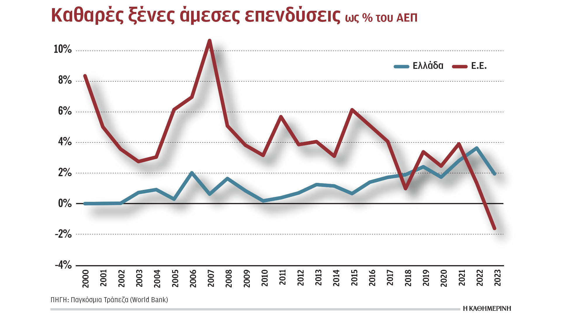 Επομένως, από τα σχεδόν 6 δισ. ευρώ των ΞΑΕ του 2024, τουλάχιστον 2 δισ. αφορούν εξαγορές υφισταμένων επιχειρήσεων, όχι την ίδρυση νέων. Οπως επισημαίνεται σε χθεσινή ανάλυση του ΚΕΠΕ, που δημοσιεύθηκε στο περιοδικό «Οικονομικές εξελίξεις», οι λεγόμενες greenfield ΞΑΕ, δηλαδή όταν μια επιχείρηση κάνει επενδύσεις από μηδενική βάση σε μια ξένη χώρα, ήταν περίπου 23% των συνολικών καθαρών ΞΑΕ τη διετία 2022-2023.