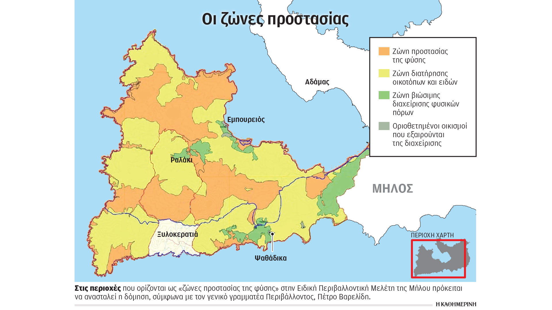 Η παρέμβαση του υπουργείου Περιβάλλοντος έρχεται βέβαια με πολύ μεγάλη καθυστέρηση. Οπως υπέδειξε και η Ελληνική Εταιρεία Περιβάλλοντος και Πολιτισμού (ΕΛΛΕΤ), «αυτή τη στιγμή στη Μήλο υπάρχει οργασμός εκσκαφών σε οικόπεδα χωρίς πρόσωπο σε δρόμο, καθώς όλοι σπεύδουν να προχωρήσουν σε οικοδομικές εργασίες και να κατοχυρώσουν δικαίωμα δόμησης πριν πραγματοποιηθεί έλεγχος των αδειών που εκδόθηκαν». Σημειώνει δε ότι στο νησί συνεχίζουν να εκδίδονται αθρόα οικοδομικές άδειες σε «τυφλά» οικόπεδα (χωρίς πρό-σωπο σε αναγνωρισμένη οδό).