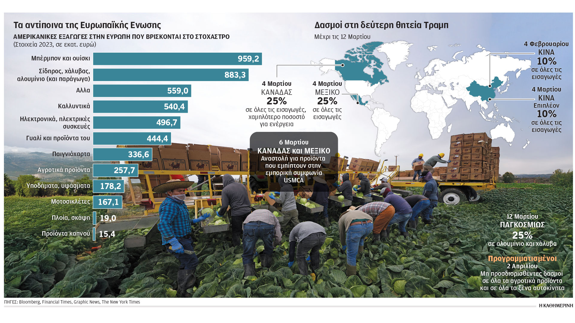 Η εφαρμογή των αντιποίνων των Βρυξελλών έναντι της επίμονης εμπορικής ατζέντας προστατευτισμού του Τραμπ θα κινηθεί σε δύο φάσεις: Την 1η Απριλίου θα επανέλθουν τα υπό αναστολή αντίμετρα που ίσχυαν μεταξύ 2018-2020, κατά την πρώτη θητεία δηλαδή του Τραμπ, και αφορούν προϊόντα όπως ουίσκι, σκάφη και μοτοσικλέτες Harley-Davidson, προκειμένου να καλυφθούν οικονομικές ζημίες ύψους 8 δισ. ευρώ. Εως τα μέσα Απριλίου η Ε.Ε. θα επιβάλει νέο γύρο αντιμέτρων, που θα επηρεάσουν τις αμερικανικές εξαγωγές αξίας έως και 18 δισ. ευρώ, ώστε να φθάσουν συνολικά στα 26 δισ. ευρώ και να αντισταθμίσουν τη συνολική κλίμακα των αμερικανικών δασμών με τρόπο «αναλογικό», σύμφωνα με Ευρωπαίους αξιωματούχους.
