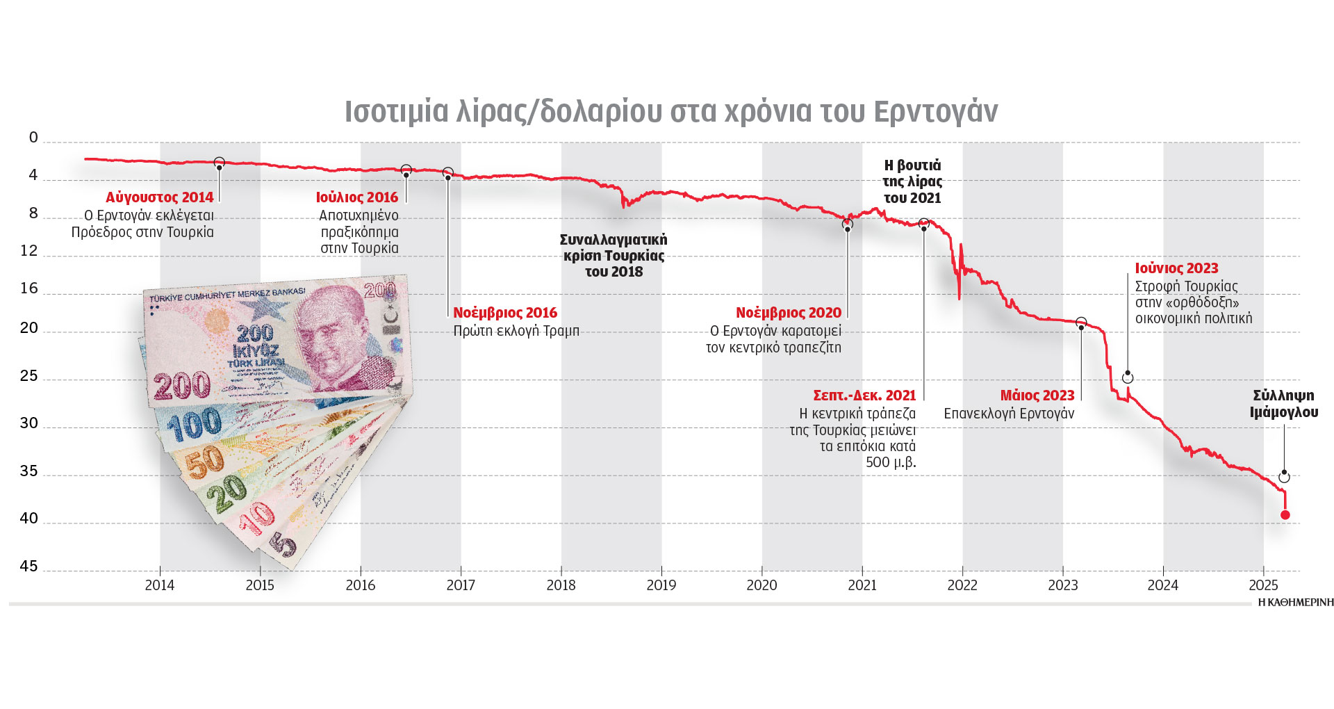 Ειδικότερα, η τουρκική λίρα κατέγραψε βουτιά πάνω από 12% φτάνοντας το ιστορικό χαμηλό του 42 έναντι του δολαρίου, ωστόσο ανέκτησε μέρος των απωλειών στη συνέχεια και βρέθηκε στο 37,91 έπειτα και από την έμμεση παρέμβαση-ρεκόρ της κεντρικής τράπεζας, η οποία πάντως δεν ήταν αρκετή για να εμποδίσει τη μεγαλύτερη ημερήσια πτώση του νομίσματος από τον Ιούλιο του 2023. Οι συναλλαγές στον δείκτη BIST 100 του χρηματιστηρίου της Κωνσταντινούπολης διακόπηκαν δύο φορές, ενώ τελικά η αγορά έκλεισε με πτώση της τάξεως του 8,72%, διαγράφοντας όλα τα κέρδη που είχε σημειώσει ο δείκτης από τις αρχές του έτους, με τις τραπεζικές μετοχές να καταγράφουν «ελεύθερη πτώση» σχεδόν 10%. Παράλληλα, η απόδοση του 10ετούς τουρκικού ομολόγου εκτινάχθηκε κατά 175 μονάδες βάσης και άγγιξε το 30%. Οπως σχολιάζουν οι αναλυτές, οι τριγμοί στις αγορές της Τουρκίας αποτελούν σοκ εμπιστοσύνης για τους επενδυτές, έστω και αν είναι συνηθισμένοι στη… χρόνια έντονη αστάθεια των τουρκικών περιουσιακών στοιχείων. Το τελευταίο διάστημα το κλίμα απέναντι στη χώρα είχε βελτιωθεί, καθώς υπήρχε η αίσθηση περισσότερης ανεξαρτησίας στην πολιτική καθώς και στη νομισματική πολιτική, και πλέον όλα αυτά τίθενται εκ νέου εν αμφιβόλω.