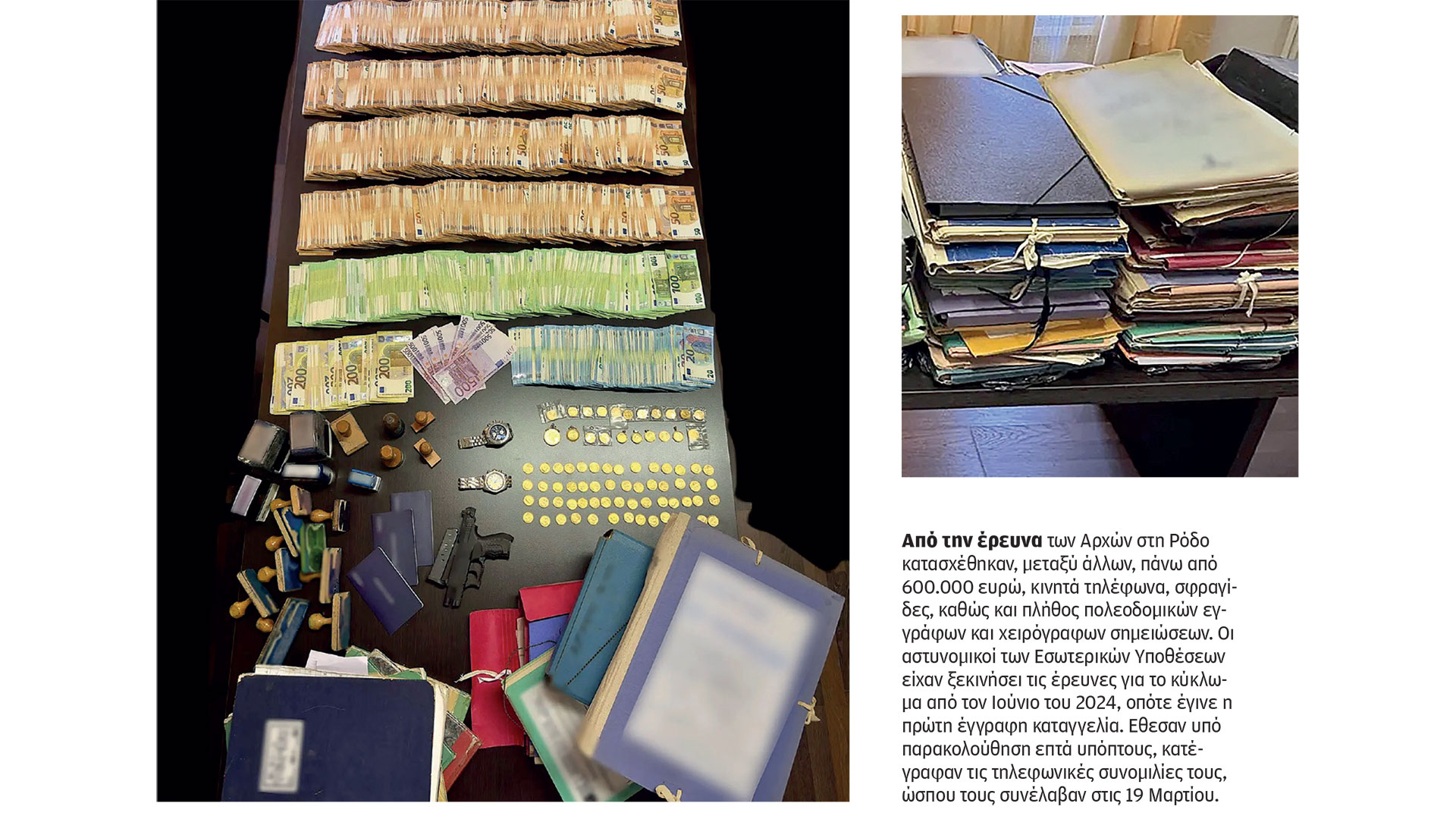 Οι αστυνομικοί των Εσωτερικών Υποθέσεων ξεκίνησαν έκτοτε να παρακολουθούν επτά υπόπτους, πέντε υπαλλήλους της υπηρεσίας δόμησης Ρόδου, έναν ιδιώτη αρχιτέκτονα μηχανικό και μία πολιτικό μηχανικό. Κατέγραφαν τις τηλεφωνικές συνομιλίες τους, ώσπου τους συνέλαβαν στις 19 Μαρτίου. Σε ένα από τα σπίτια κατηγορούμενης υπαλλήλου εντοπίστηκαν 387.100 ευρώ σε μετρητά.