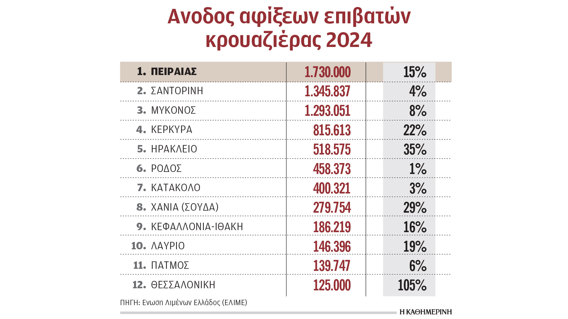 Το 2024 οι κορυφαίοι προορισμοί κρουαζιέρας ήταν ο Πειραιάς (1,7 εκατ. επιβάτες), η Σαντορίνη (1,3 εκατ.) και η Μύκονος (1,2 εκατ.).