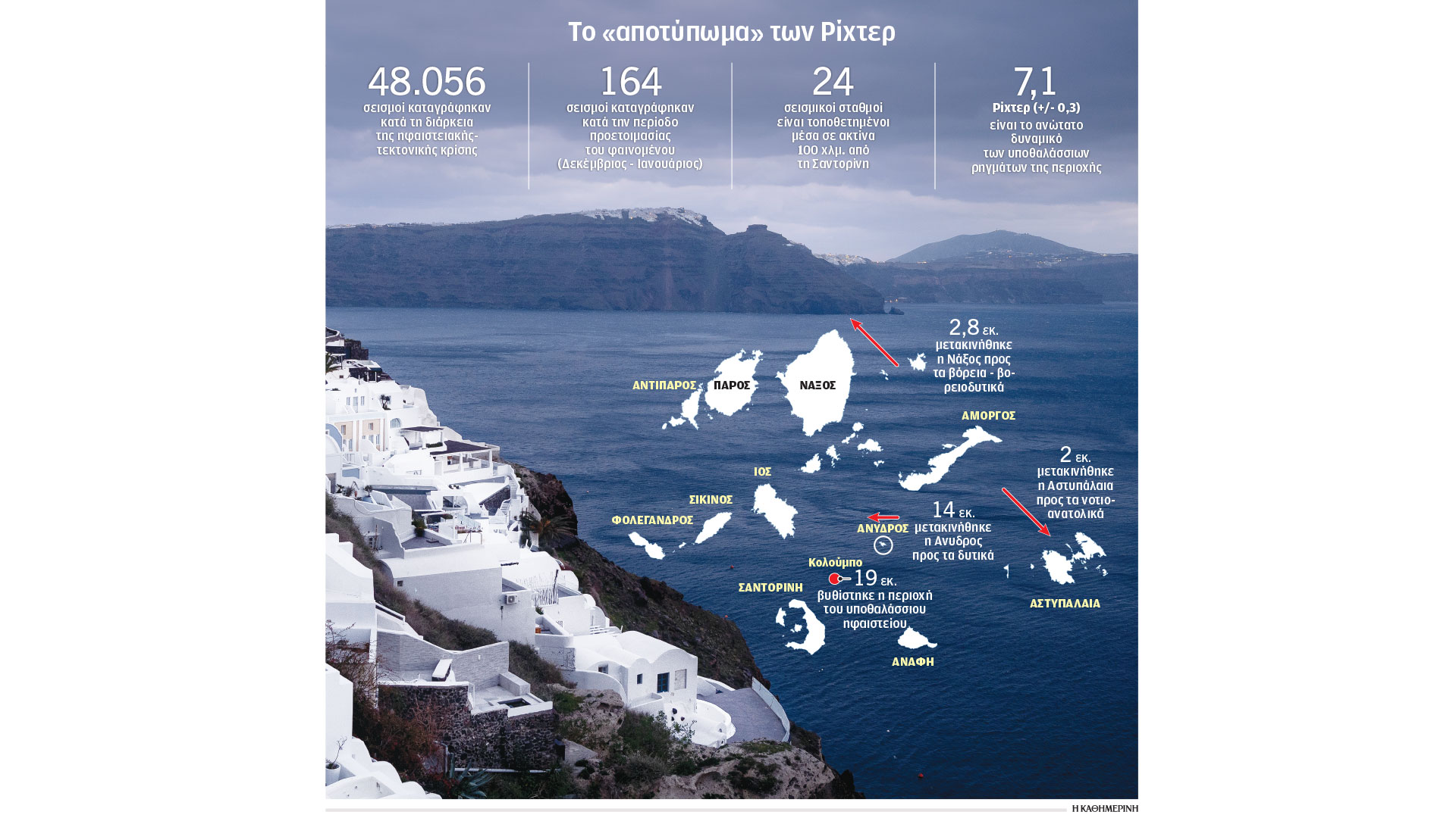 Με αυτή την ενδιαφέρουσα παρομοίωση η Μαργαρίτα Σέγκου, διευθύντρια Ερευνών στο British Geological Survey, περιέγραψε πολύ συνοπτικά τον μηχανισμό που οδήγησε στην κρίση του περασμένου Φεβρουαρίου. Μια κρίση που, όπως ανέφερε ο διευθυντής Ερευνών στο Γεωδυναμικό Ινστιτούτο Θανάσης Γκανάς, είχε ως αποτέλεσμα να μετακινηθούν η Αστυπάλαια και η Νάξος κατά 2 και 2,8 εκατοστά αντίστοιχα. Και, όπως προσέθεσε η καθηγήτρια Γεωλογικής Ωκεανογραφίας στο Πανεπιστήμιο Αθηνών Εύη Νομικού, η περιοχή του υποθαλάσσιου υφαιστείου του Κολούμπο να βυθιστεί κατά 19 εκατοστά.