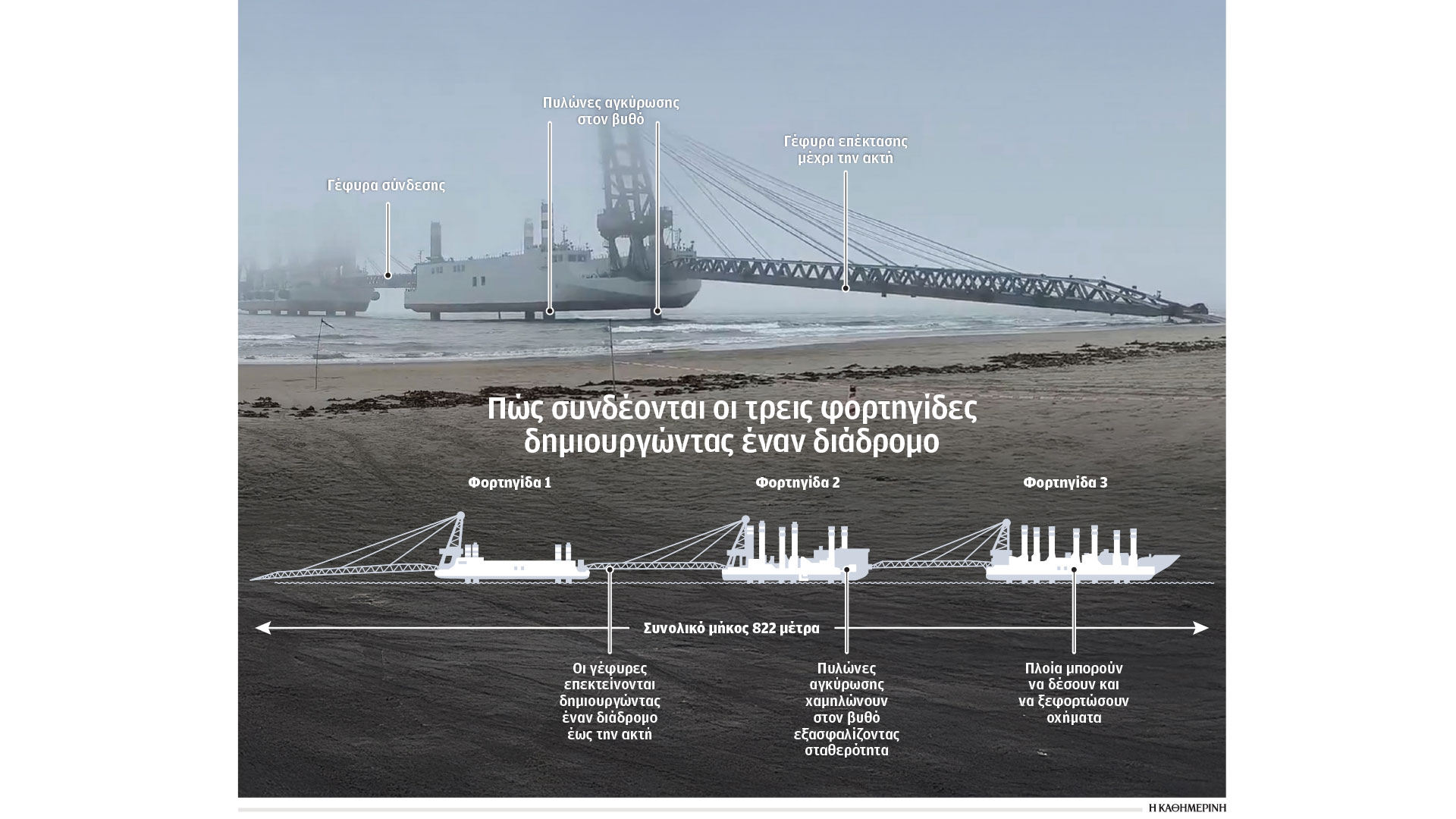 Η δυτική ακτογραμμή της Ταϊβάν που κοιτάζει προς την κινεζική ενδοχώρα έχει λίγες παραλίες και λιμάνια, τα οποία φυλάσσονται καλά. Ομως η γέφυρα από φορτηγίδες, ειδικά αν επιμηκυνθεί, θα μπορούσε να επιτρέψει στην Κίνα να οδηγήσει τον στρατό της σε μέρη που είναι πιο δύσβατα αλλά και πιο δύσκολο να φυλαχθούν.