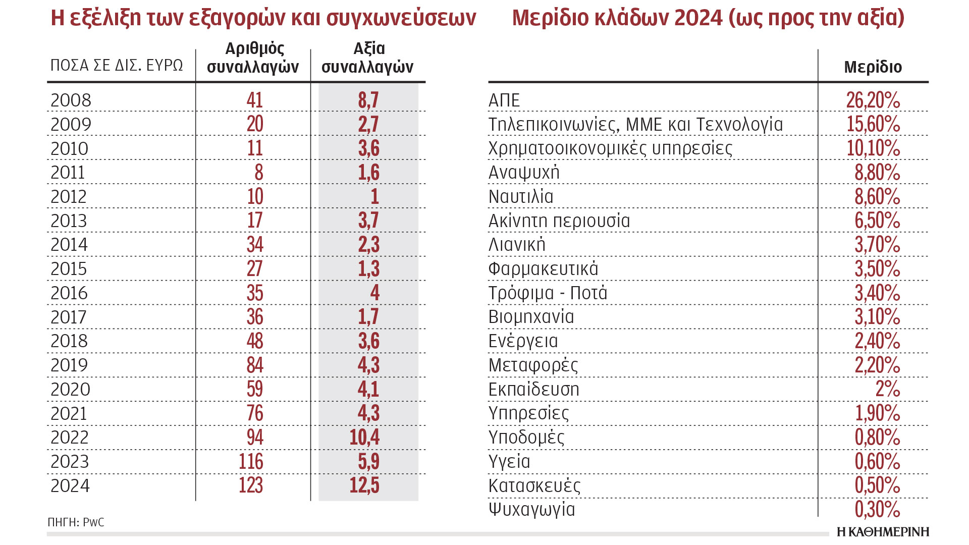 Ανανεώσιμες πηγές ενέργειας, τεχνολογία, τρόφιμα και φάρμακα είναι οι κλάδοι που αναμένεται να πρωτοστατήσουν στις εξαγορές και συγχωνεύσεις στην Ελλάδα το 2025, μια χρονιά κατά την οποία εκτιμάται ότι θα καταρριφθεί το ρεκόρ που σημειώθηκε το 2024. Ηδη, με το πρώτο τρίμηνο του 2025 να έχει μόλις κλείσει, έχουν υπογραφεί ή πρόκειται να ολοκληρωθούν μες στο προσεχές διάστημα συμφωνίες συνολικού ύψους άνω των 7,5 δισ. ευρώ, εκ των οποίων το 1,4 δισ. ευρώ αφορά ιδιωτικοποιήσεις. Αιτίες γι’ αυτή την επενδυτική «έξαρση»; Οπως επεσήμανε χθες ο Θανάσης Πανόπουλος, επικεφαλής του τμήματος Επιχειρηματικών Συμφωνιών (Head of Deals) της PwC Ελλάδος, είναι η συνέχιση της θετικής πορείας της ελληνικής οικονομίας, η ανάκτηση της επενδυτικής βαθμίδας, το πρόσφορο, σε ορισμένους κλάδους, έδαφος για γρήγορη ανάπτυξη και φυσικά το γεγονός ότι στην Ελλάδα δεν έχει… εξαντληθεί ακόμη το περίφημο «ελατήριο» μετά την πολυετή οικονομική κρίση. Κρίσιμο ρόλο διαδραματίζει, εξάλλου, το γεγονός ότι πλέον οι συναλλαγές –είτε από τη θέση του πωλητή είτε από τη θέση του αγοραστή– έχουν ενσωματωθεί στη νοοτροπία των Ελλήνων επιχειρηματιών, σε αντίθεση με ό,τι συνέβαινε τα προηγούμενα χρόνια.