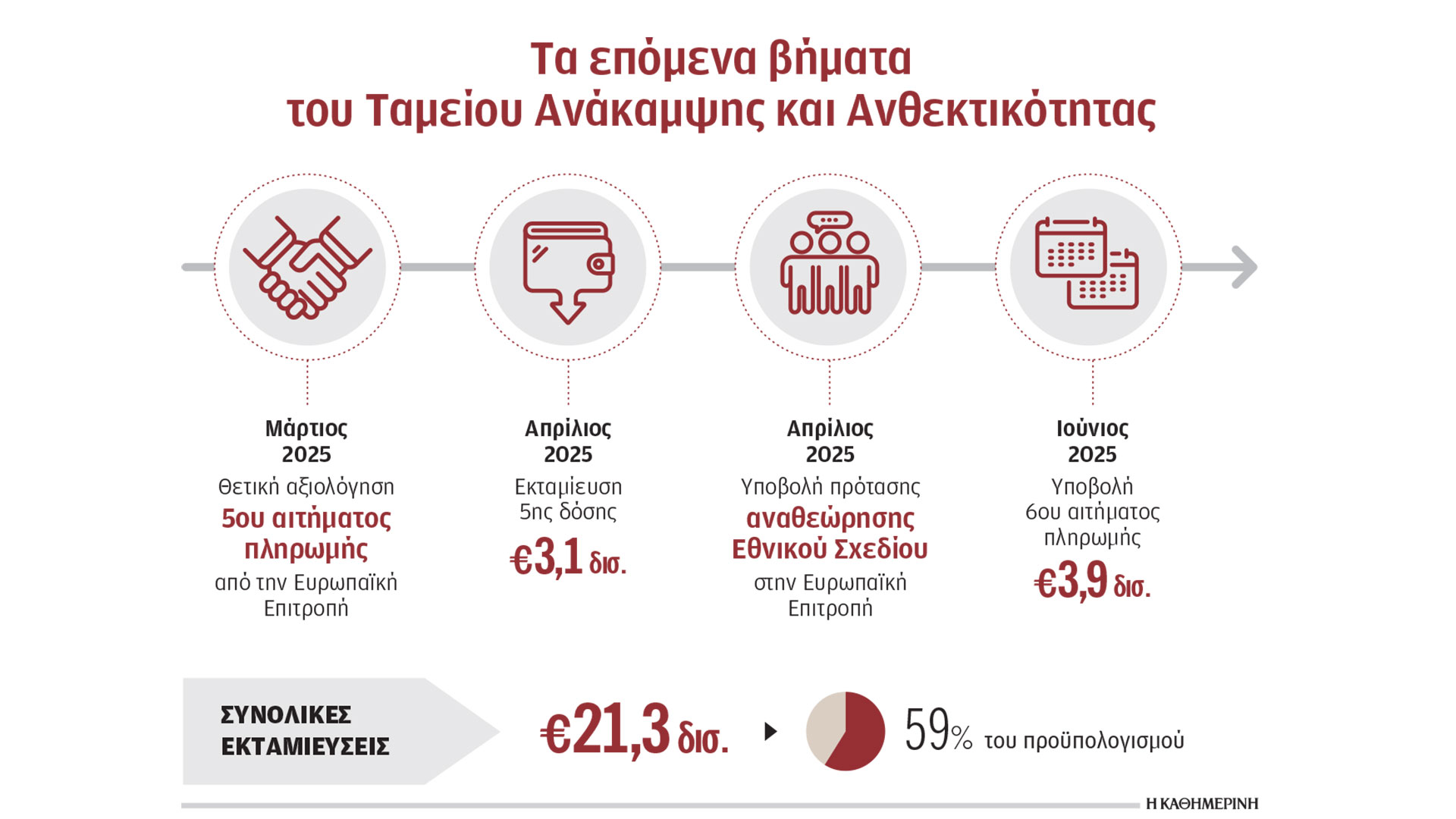 Εν τω μεταξύ, επίκειται και η αναθεώρηση του Ταμείου Ανάκαμψης. Σύμφωνα με τον κ. Παπαθανάση, αυτή προβλέπεται να ολοκληρωθεί έως το τέλος Απριλίου, ώστε να υποβληθεί τέλη Μαΐου με αρχές Ιουνίου το 6ο αίτημα πληρωμής, ύψους 3,9 δισ. ευρώ. Στη συνέχεια, τέλη Οκτωβρίου με αρχές Νοεμβρίου, σύμφωνα με τον ίδιο, θα υποβληθεί το 7ο αίτημα ύψους 3,5 δισ. ευρώ. Τα δύο τελευταία αιτήματα, 8ο και 9ο, θα υποβληθούν το 2026.