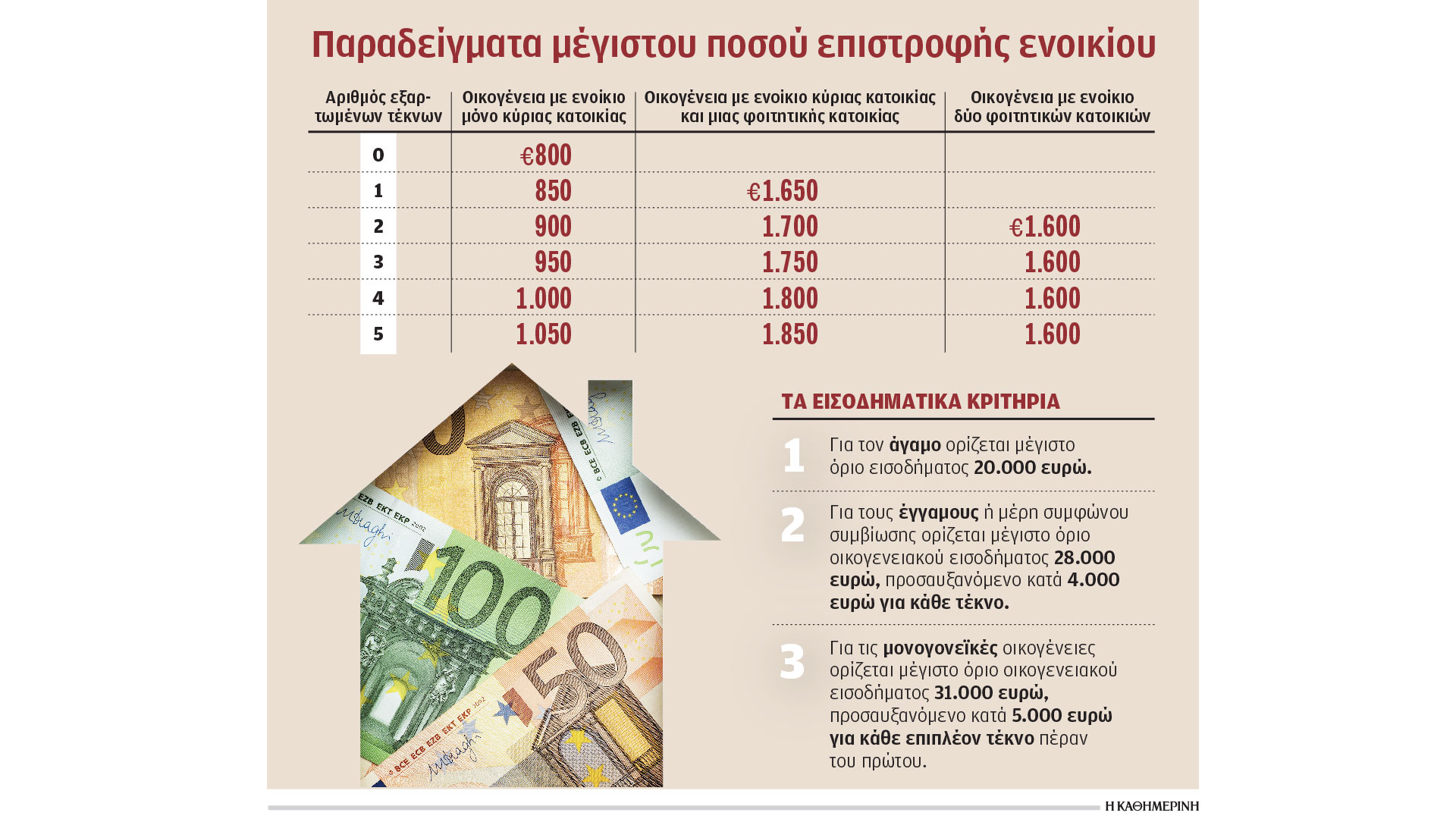 Η επιστροφή θα ισχύει και για τις φοιτητικές κατοικίες. Ισχύει εισοδηματικό κριτήριο (όπως στο «Σπίτι μου ΙΙ»): έως 20.000 ευρώ για άγαμο, 28.000 ευρώ για έγγαμο συν 4.000 ευρώ για κάθε παιδί.