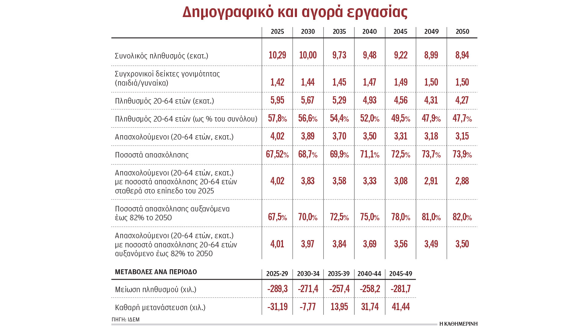 Υιοθετώντας το σενάριο σχεδόν μηδενικής μετανάστευσης (48.200 για την περίοδο 2025-2049), αύξησης του προσδόκιμου ζωής κατά σχεδόν τέσσερα έτη (στα 83,7 για τους άνδρες και στα 88,1 για τις γυναίκες το 2050) και δείκτες γονιμότητας 1,4-1,5 παιδιά ανά γυναίκα, το βασικό συμπέρασμα είναι ότι το 2050 θα έχουμε μια μείωση του συνολικού πληθυσμού κατά 1,36 εκατομμύριο (8,935 αντί 10,293 εκατομμυρίων το 2025), μια μείωση των 20-64 ετών κατά σχεδόν 1,68 εκατομμύριο (4,27 το 2050 αντί 5,95 εκατομμυρίων το 2025), ενώ οι 65 και άνω θα αυξηθούν κατά περίπου 700.000 (3,15 εκατομμύρια το 2050 έναντι 2,45 εκατομμυρίων σήμερα). Με βάση αυτό το σενάριο, το 2050 θα αντιστοιχούν μόνο 1,35 άτομα 20-64 ετών σε κάθε ηλικιωμένο 65 ετών και άνω αντί των 2,43 σήμερα.