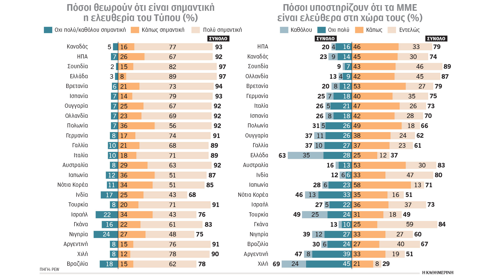 ΟΥΑΣΙΓΚΤΟΝ. Τη σημασία της ελεύθερης παρουσίασης των ειδήσεων από τα μέσα ενημέρωσης παραδέχεται η πλειονότητα των κατοίκων του κόσμου, η οποία συμφωνεί επίσης στην αξία της ελεύθερης έκφρασης και της χρήσης του Ιντερνετ χωρίς κρατική λογοκρισία, σύμφωνα με μελέτη του ινστιτούτου Pew. Ποσοστό 61% των ερωτηθέντων πολιτών σε 35 χώρες ανέφερε ότι η ελευθεροτυπία είναι πολύ σημαντική, αλλά μόλις το 28% θεωρεί ότι τα ΜΜΕ είναι εντελώς ελεύθερα να μεταδώσουν τις ειδήσεις στη χώρα τους. Μελανή εξαίρεση μεταξύ των ευρωπαϊκών χωρών στη γενικευμένη αίσθηση ότι τα ΜΜΕ είναι ελεύθερα αποτελεί η Ελλάδα, με την πλειονότητα των ερωτηθέντων να εκτιμά ότι τα ελληνικά ΜΜΕ δεν είναι ελεύθερα να μεταδίδουν τις ειδήσεις και 35% από αυτούς να πιστεύουν ότι τα ΜΜΕ δεν είναι καθόλου ελεύθερα.