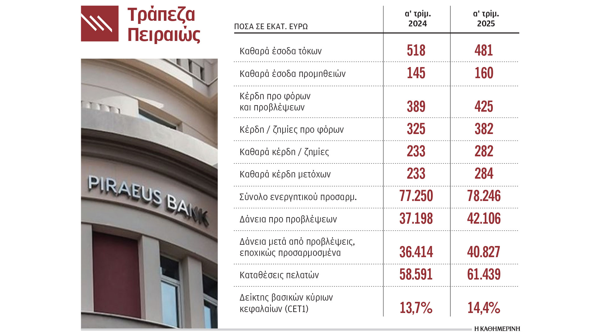 Καθαρά κέρδη 284 εκατ. ευρώ, που αντιστοιχούν σε 0,22 ευρώ κέρδη ανά μετοχή και 14,7% απόδοση ιδίων κεφαλαίων, κατέγραψε η Τράπεζα Πειραιώς το α΄ τρίμηνο του έτους, πιστοποιώντας, σύμφωνα με τη διοίκηση, «τη δυναμική έναρξη του 2025» και την εκτίμηση για «υπέρβαση των στόχων» που έχει θέσει για το σύνολο του έτους.