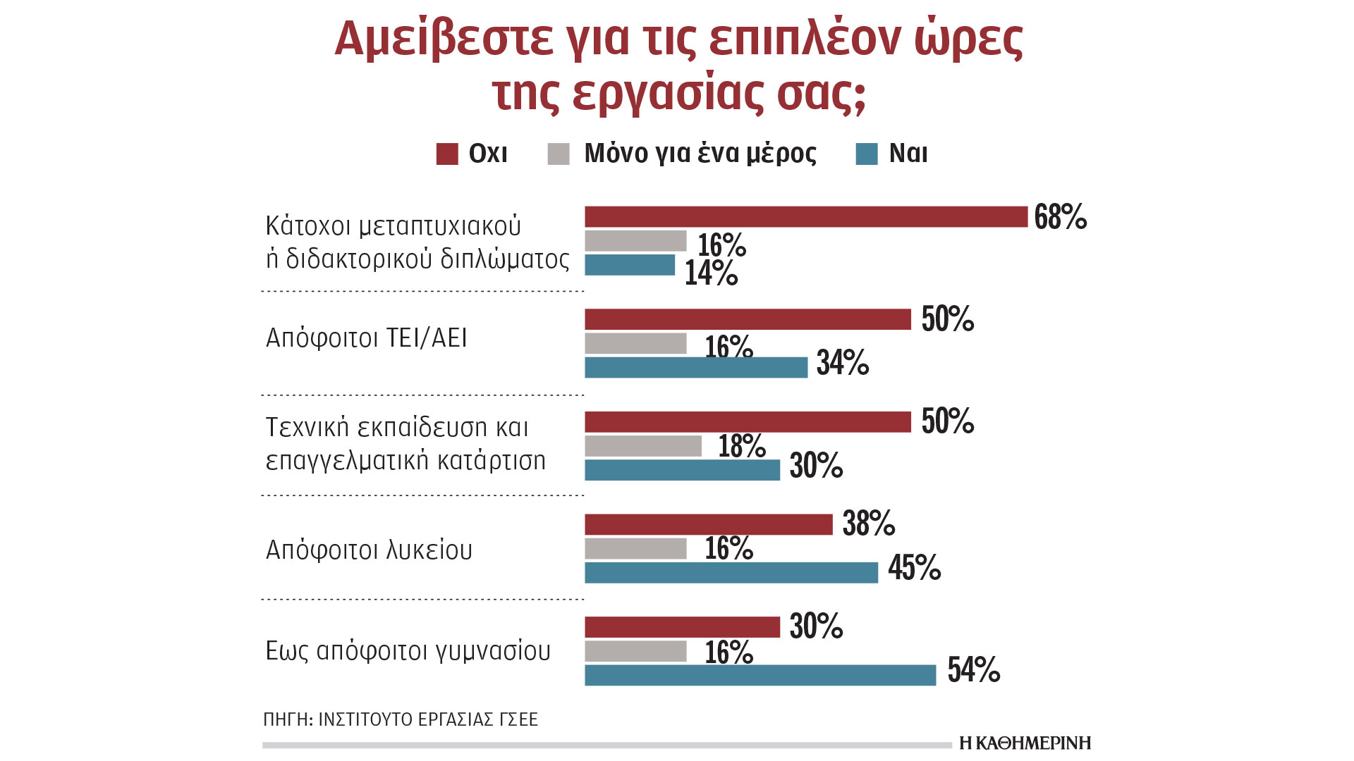 Το 52% των ερωτηθέντων δήλωσε ότι εργάζεται επιπλέον ώρες από αυτές που ορίζει η σύμβασή του. Το 15% ανέφερε πως εργάζεται 1-2 ώρες παραπάνω, το 14% επιπλέον 3-5 ώρες και ένα 9% απασχολείται υπερωριακά πάνω από 10 ώρες την εβδομάδα. Σχεδόν οι μισοί από εκείνους που συμμετείχαν στην έρευνα (49%) δήλωσαν ότι δεν αμείβονταν για τις επιπλέον ώρες εργασίας τους, ενώ το 16% έλαβε μόνο ένα μέρος από την προβλεπόμενη αμοιβή. Το 55% των ερωτηθέντων με μεταπτυχιακό ή διδακτορικό τίτλο δήλωσε ότι εργάζεται πάνω από 10 ώρες ημερησίως τουλάχιστον μία φορά τον μήνα. Το 68% εξ αυτών δεν έλαβε καμία αμοιβή για την υπερεργασία του. Οι κλάδοι όπου οι εργαζόμενοι απασχολούνται επιπλέον πάνω από 10 ώρες την εβδομάδα, περισσότερες από δύο φορές τον μήνα, είναι: επιστημονικές, επαγγελματικές και τεχνικές δραστηριότητες (39%), μεταφορά και αποθήκευση (38%), κατασκευές (37%), δραστηριότητες υπηρεσιών παροχής καταλύματος, υπηρεσίες εστίασης και εκπαίδευση (35%), μεταποίηση (32%).