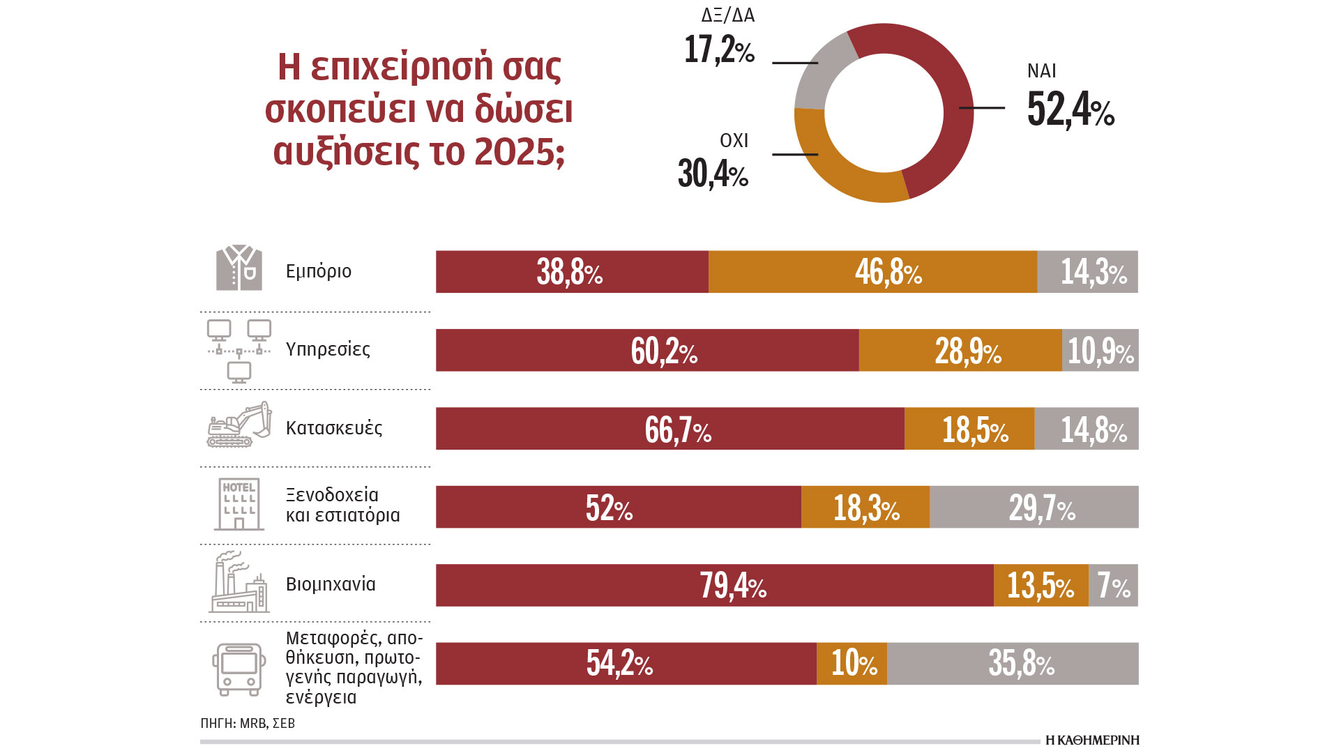 Οι επιχειρήσεις, σύμφωνα με την έρευνα της MRB, αξιολογούν θετικά την παρούσα κατάσταση της χώρας, αυξάνονται ωστόσο οι προβληματισμοί για το μέλλον. Παρά την ανησυχία, το 2025, πάνω από εννέα στις δέκα επιχειρήσεις είτε θα αυξήσουν είτε θα διατηρήσουν σταθερό το προσωπικό τους. Επίσης, πάνω από τις μισές επιχειρήσεις θα δώσουν αυξήσεις στους μισθούς το 2025, με τη βιομηχανία να είναι η πιο γαλαντόμα (πάνω από το 79,4% των βιομηχανικών επιχειρήσεων). Κόστος ενέργειας, φορολογία επιχειρήσεων, φόροι και ασφαλιστικές εισφορές παραμένουν τα διαχρονικά προβλήματα για επιχειρήσεις κάθε μεγέθους. Δειλά κινείται το ελληνικό επιχειρείν στον τομέα του ΑΙ με μόλις μία στις τέσσερις επιχειρήσεις να έχουν προετοιμάσει κάτι. Οι χαμηλοί ρυθμοί μεταρρυθμίσεων, το ρευστό διεθνές περιβάλλον και η κλιματική κρίση είναι οι μεγάλες προκλήσεις για τις ελληνικές επιχειρήσεις, σύμφωνα με τον πρόεδρο του ΣΕΒ.
