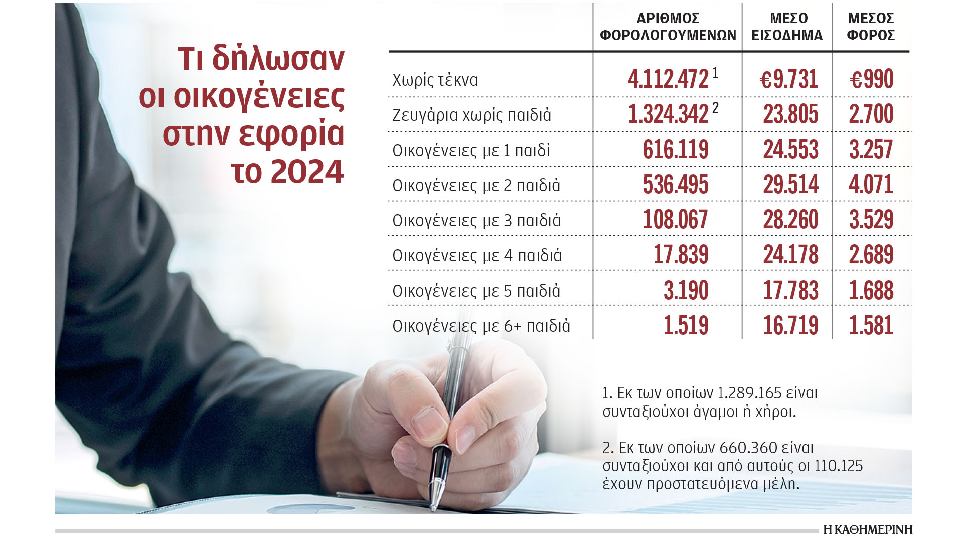 Μόλις 1.283.223 οικογένειες έχουν παιδιά, όπως προκύπτει από τα στοιχεία που δήλωσαν στην εφορία το προηγούμενο έτος. Από το σύνολο των οικογενειών, τα περισσότερα παιδιά έχουν οι μισθωτοί και ακολουθούν οι ελεύθεροι επαγγελματίες. Συγκεκριμένα, 719.155 οικογένειες με παιδιά εργάζονται ως μισθωτοί, ενώ 306.978 οικογένειες με παιδιά είναι ελεύθεροι επαγγελματίες. Συνολικά 4.112.472 φορολογούμενοι (εκ των οποίων 1.289.165 είναι συνταξιούχοι, άγαμοι ή χήροι) δεν έχουν παιδιά, ενώ τα παντρεμένα ζευγάρια χωρίς παιδί ανέρχονται σε 1.324.342 (εκ των οποίων 660.360 είναι συνταξιούχοι και από αυτούς προστατευόμενα μέλη έχουν 110.125).