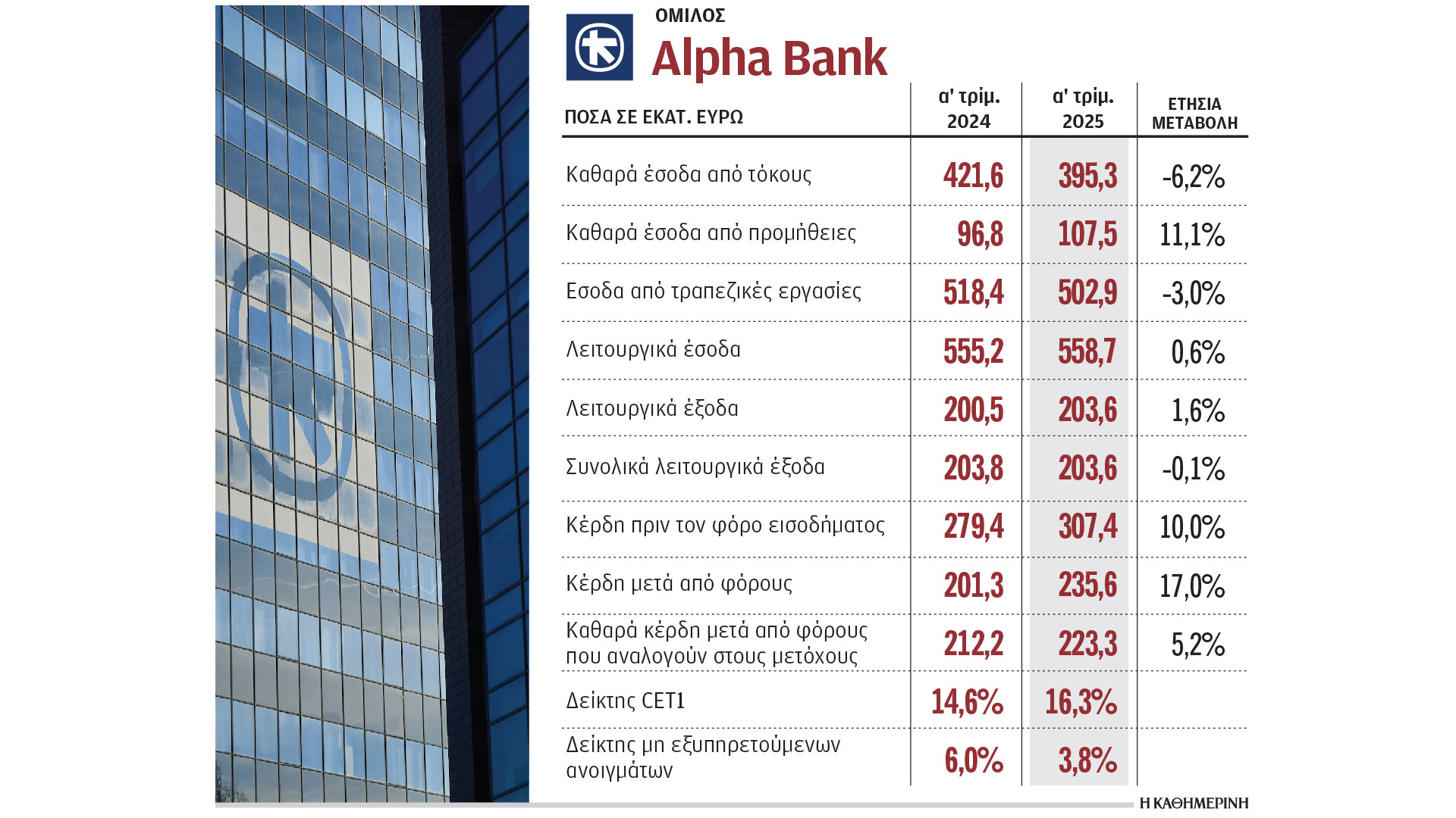 Καθαρά κέρδη μετά από φόρους 239 εκατ. ευρώ κατέγραψε η Alpha Bank το α΄ τρίμηνο του 2025, αυξημένα κατά 7,6% σε ετήσια βάση και 22,2% σε σχέση με το δ΄ τρίμηνο του 2024. «Η Alpha Bank διατηρεί τη δυναμική της και το 2025, καταγράφοντας το ισχυρότερο τρίμηνο από απόψεως κερδοφορίας στην ιστορία της», επίδοση που σύμφωνα με τον διευθύνοντα σύμβουλο του Ομίλου, Βασίλη Ψάλτη, «μας τοποθετεί σε σταθερή τροχιά επίτευξης των στόχων».