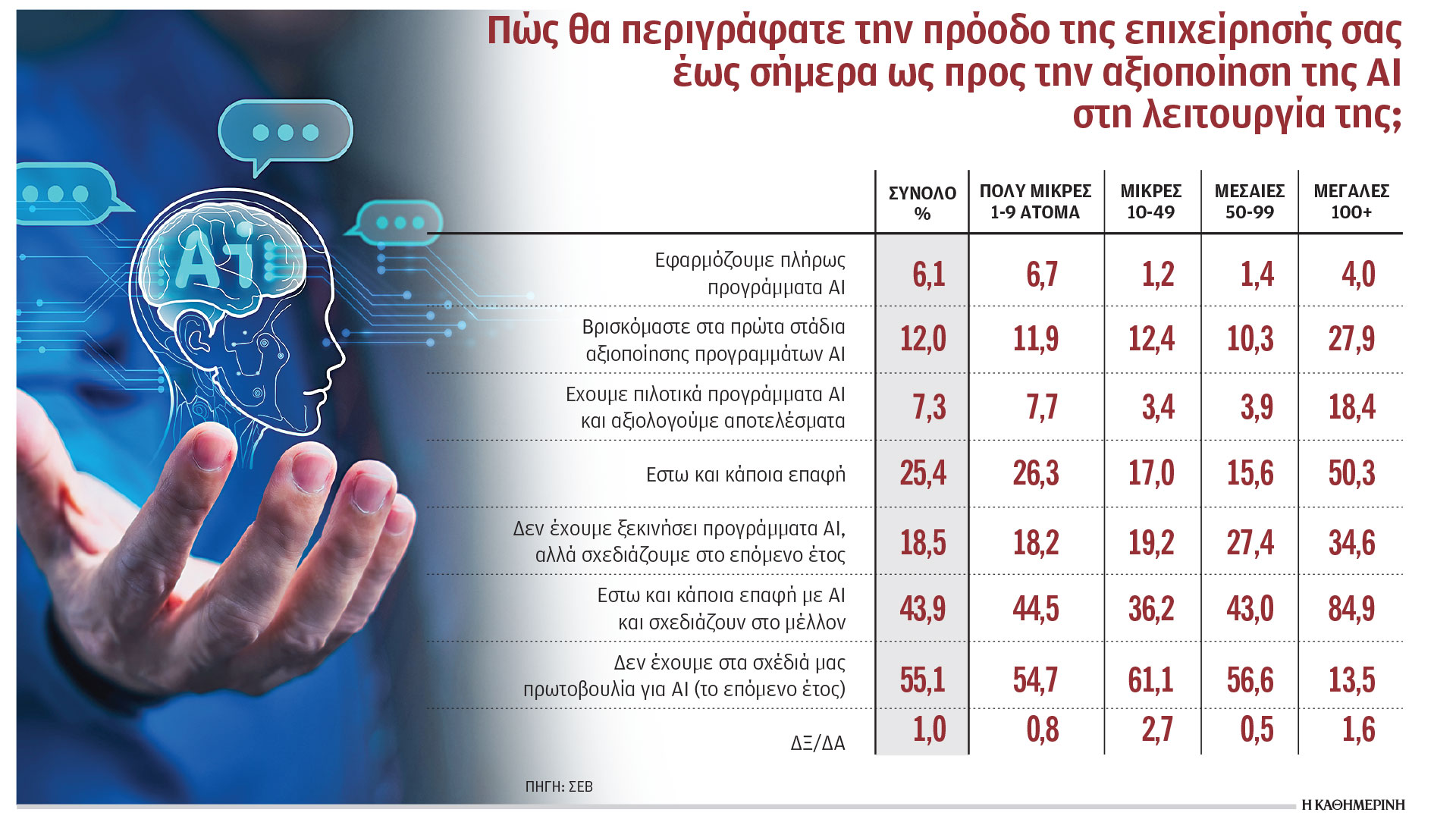 Συγκεκριμένα, το 55% των επιχειρήσεων δήλωσε ότι δεν σκοπεύει να αξιοποιήσει κάποιο εργαλείο τεχνητής νοημοσύνης εντός του επόμενου έτους. Από το ποσοστό αυτό, μόλις το 14% αφορά μεγάλες επιχειρήσεις, γεγονός που υποδηλώνει πως η πλειονότητα των μικρομεσαίων παραμένει αδιάφορη ως προς τις τεχνολογικές εξελίξεις. Επιπλέον, μία στις τέσσερις ανέφερε ότι έχει αναλάβει κάποια πρωτοβουλία σε σχέση με την Τ.Ν., ωστόσο οι περισσότερες βρίσκονται ακόμη σε αρχικό στάδιο ή περιορίζονται σε πιλοτικά προγράμματα.