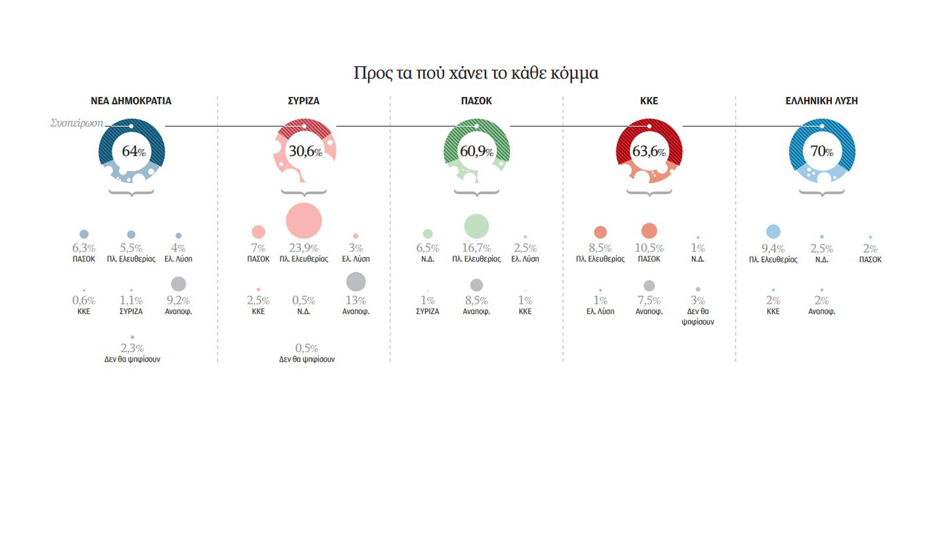 Ο στόχος διπλός: αφενός να απευθυνθεί στη βάση του ΠΑΣΟΚ αφετέρου να αναχαιτίσει τις δικές της διαρροές προς τα εκεί. Από την εξίσωση πάντως δεν μπορούν να βγουν και οι χαμηλές συσπειρώσεις του ΠΑΣΟΚ που είναι στο 60,9% και του ΣΥΡΙΖΑ που είναι στο 30,6%, ακόμα και του ΚΚΕ που βρίσκεται στο πολύ χαμηλό για τα δικά του δεδομένα 63,6%. Ολα τα παραπάνω αποτυπώνουν μία πρωτοφανή ρευστότητα που κανείς δεν ξέρει πώς θα βγει, ειδικά σε περίπτωση κάποιου τυχαίου περιστατικού που μπορεί να πυροδοτήσει νέα πολυδιάσπαση και πολιτικό χάος.