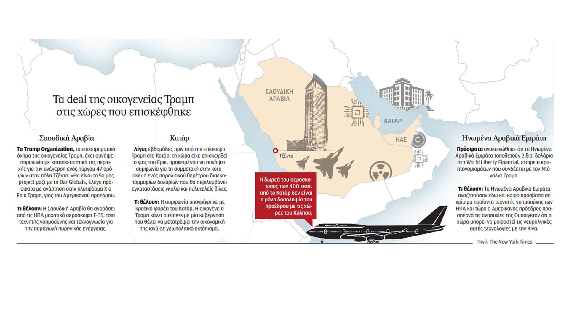 Το άρωμα του χρήματος από τα πετροδόλαρα της Μέσης Ανατολής ανέβλυζε καθ’ όλη τη διάρκεια της επίσκεψης του προέδρου των ΗΠΑ στον Περσικό Κόλπο. Στο επίκεντρο της περιοδείας Τραμπ τέθηκαν ευθέως οι επιχειρηματικές ευκαιρίες μέσα από τη στενότερη συνεργασία της Ουάσιγκτον με τα αραβικά έθνη, όπως υποδηλώνει το γεγονός ότι μόνον η επίσκεψη στο Ριάντ απέφερε τη δέσμευση για επενδύσεις 600 δισ. δολαρίων από τη Σαουδική Αραβία στις ΗΠΑ και αγορές αμερικανικών οπλικών συστημάτων από το αραβικό βασίλειο αξίας 142 δισ. δολαρίων.