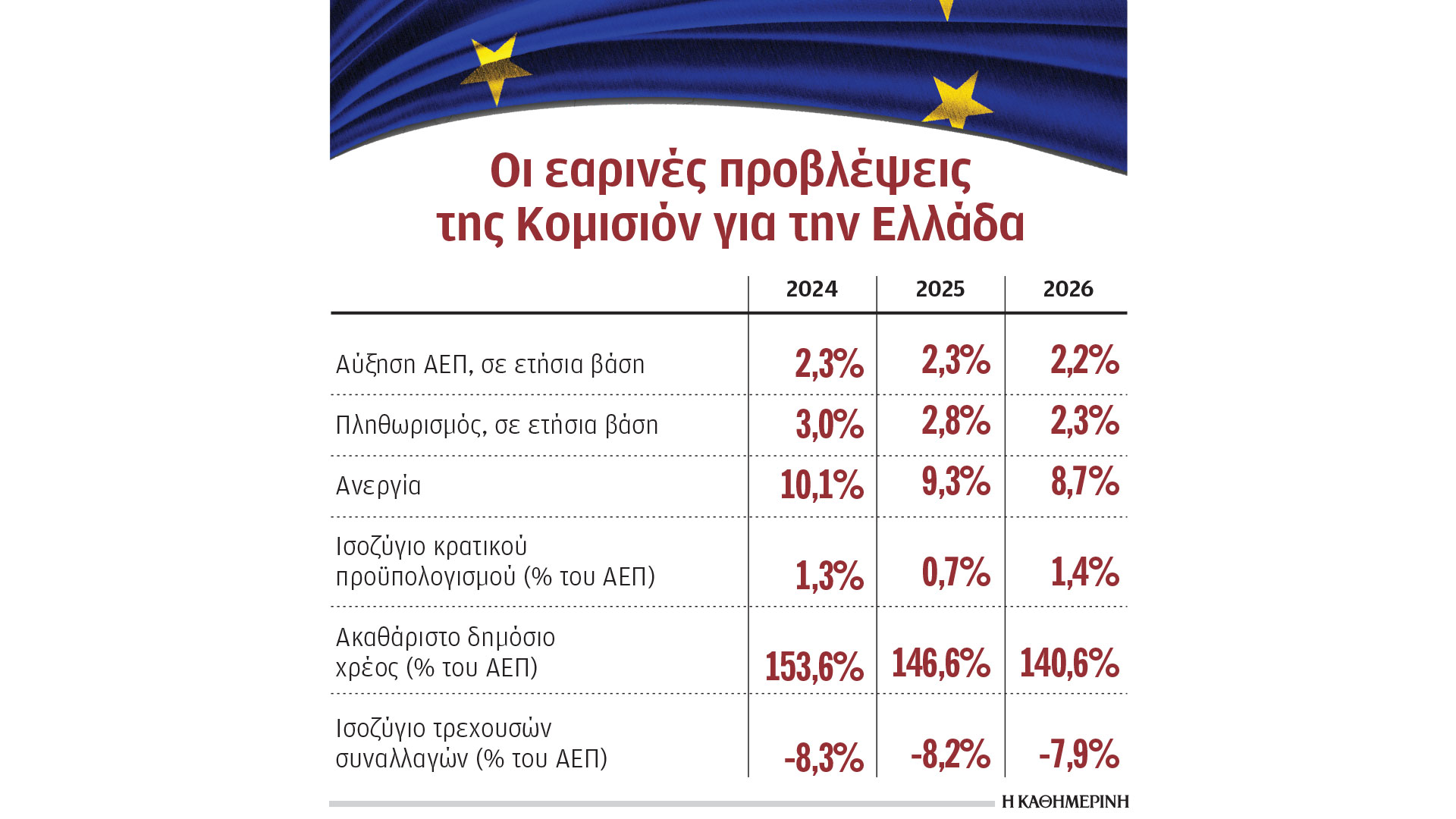 Στο 2,3% τοποθετεί η Κομισιόν τον ρυθμό ανάπτυξης για φέτος, συμφωνώντας με την εκτίμηση της κυβέρνησης και της Τράπεζας της Ελλάδος, ενώ το 2026 χαμηλώνει ελαφρώς τον πήχυ στο 2,2%.