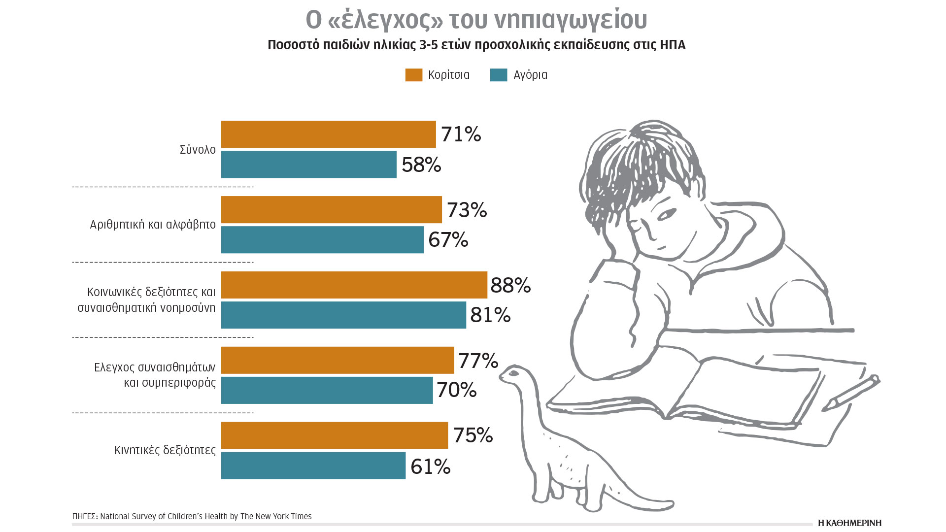 Από τον παιδικό σταθμό εμφανίζεται το μαθησιακό χάσμα στις επιδόσεις μεταξύ των δύο φύλων στις ΗΠΑ.