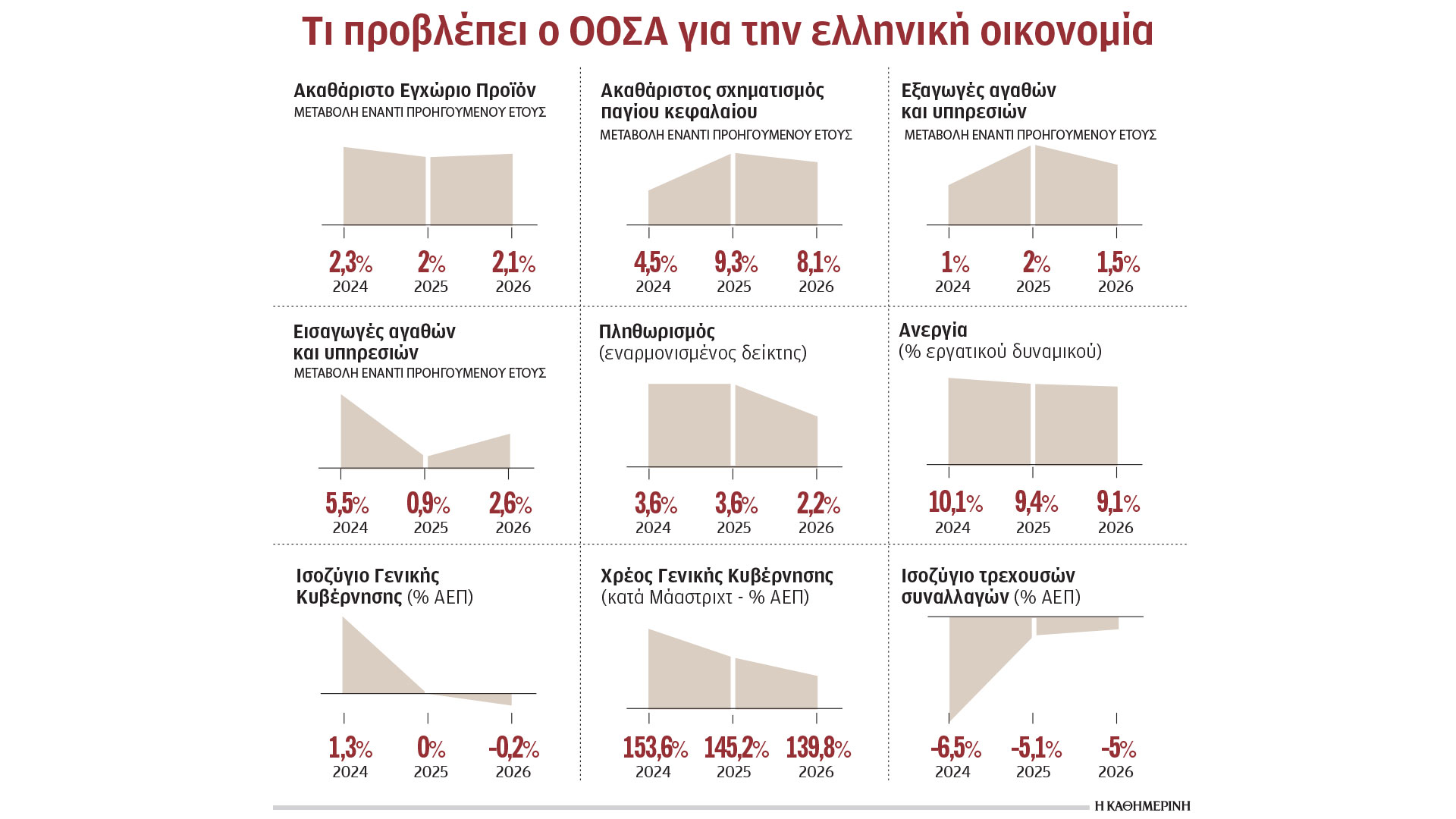 «Η οικονομία παραμένει ισχυρή», σημειώνει ο ΟΟΣΑ στην έκθεσή του Economic Outlook και προβλέπει ρυθμό ανάπτυξης 2% για το 2025 (από 2,3% της κυβέρνησης και της Κομισιόν) και 2,1% για το 2026 (από 2% της κυβέρνησης και 2,2% της Κομισιόν).