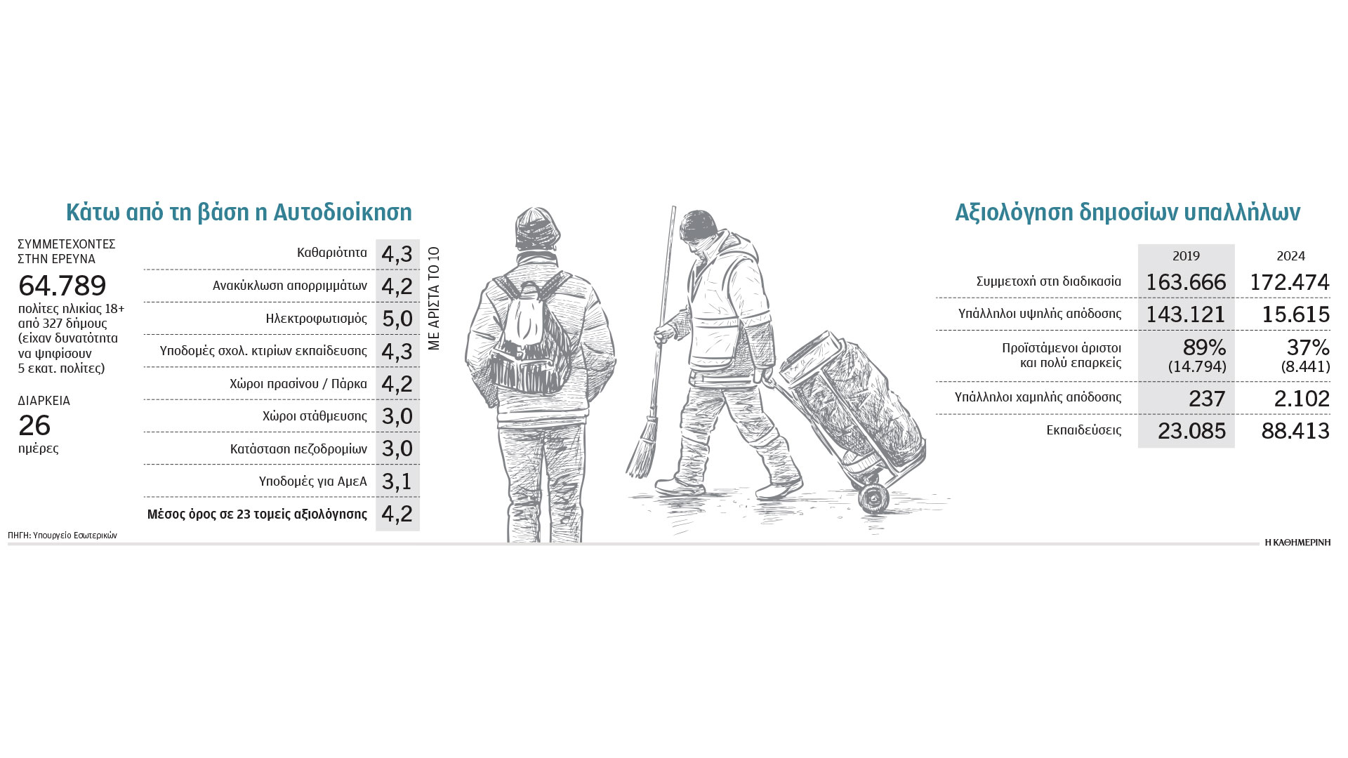 Εντυπη έκδοση. Λιγότερους άριστους και περισσότερους υπαλλήλους κάτω από τη βάση κατέγραψε το νέο σύστημα αξιολόγησης για το 2024, σε σχέση με τα αποτελέσματα του συστήματος που ίσχυε το 2019. Συγκεκριμένα, από τους 172.474 δημoσίους υπαλλήλους που αξιολογήθηκαν προέκυψε ότι 15.615 ήταν υπάλληλοι υψηλής απόδοσης, όταν το 2019 ως υπάλληλοι υψηλής απόδοσης κρίθηκαν οι 143.121 από τους 163.666 που είχαν αξιολογηθεί. Παράλληλα, 2.102 υπάλληλοι κρίθηκαν ως χαμηλής απόδοσης, όταν το 2019 μόλις 237 υπάλληλοι είχαν βρεθεί ανεπαρκείς. Επίσης με βάση το νέο σύστημα αξιολόγησης (το οποίο άρχισε να εφαρμόζεται από το 2023), το 37% των προϊσταμένων ήταν άριστοι ή πολύ επαρκείς ενώ το 2019, το 89% των προϊσταμένων ήταν άριστοι. Το νέο σύστημα αξιολόγησης πραγματοποιείται με βάση στόχους που έχουν τεθεί για τις υπηρεσίες, ενώ η διαδικασία «τρέχει» και με εφαρμογές τεχνητής νοημοσύνης.