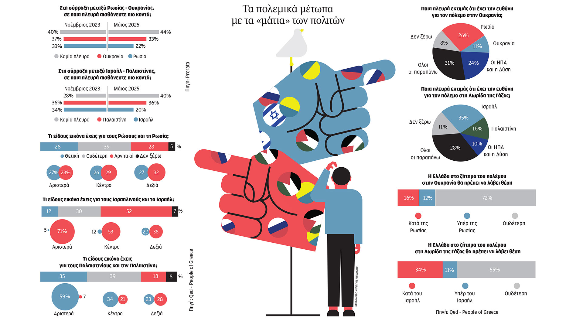 Τρία χρόνια μετά το ξέσπασμα του πολέμου στην Ουκρανία και σχεδόν δύο χρόνια μετά τη νέα ανάφλεξη στη Μέση Ανατολή, η «Κ» παρουσιάζει τις μετρήσεις τριών εταιρειών για τις διαθέσεις της ελληνικής κοινής γνώμης για τους πολέμους σε Ουκρανία και Λωρίδα της Γάζας, τη γνώμη τους για τη Ρωσία, το Ισραήλ και την Παλαιστίνη, καθώς και τις αντιλήψεις που επικρατούν για τα συμφέροντα της χώρας.