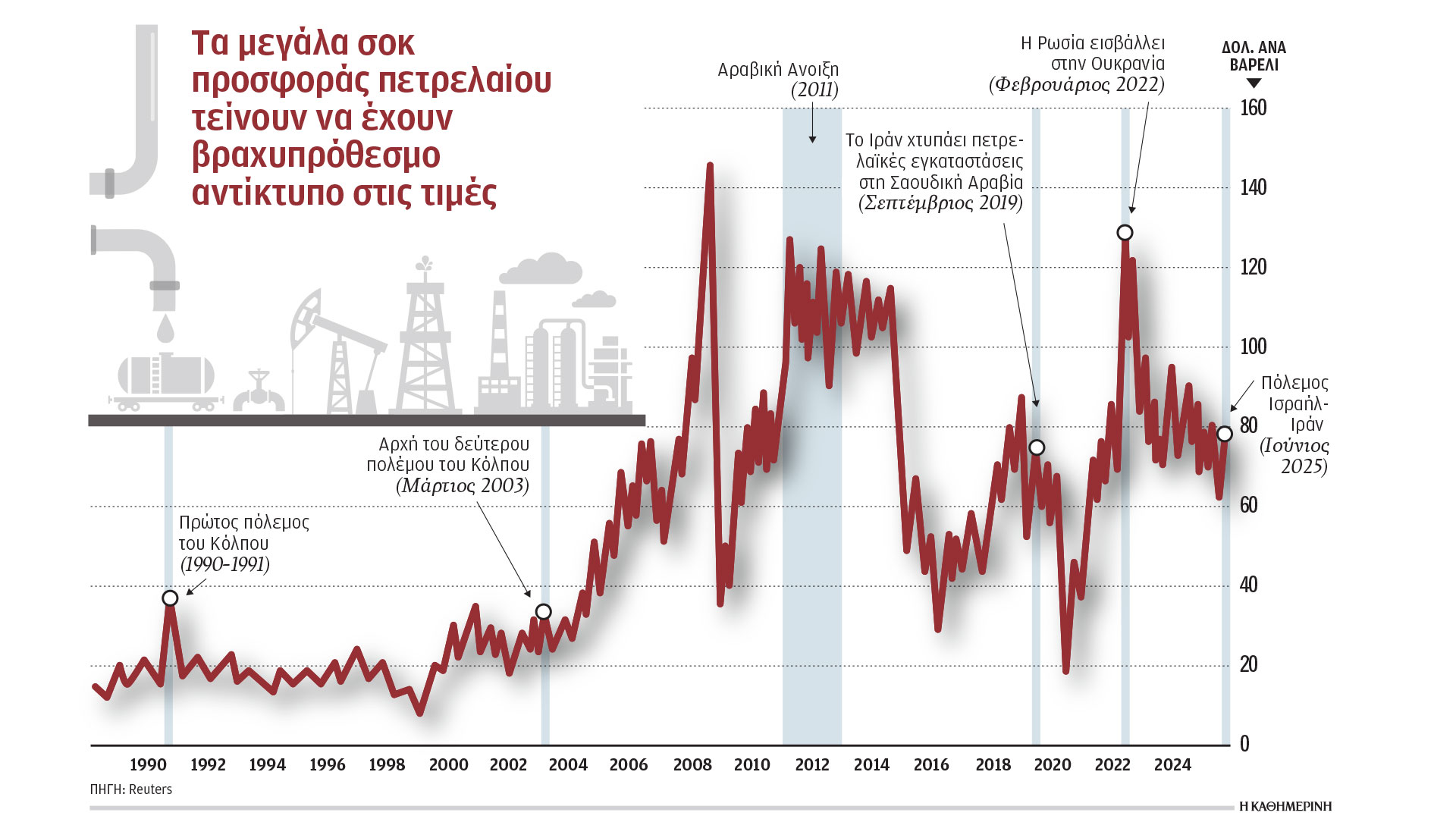 Δεδομένης αυτής της αβεβαιότητας, οι τιμές του Brent εκτινάχθηκαν τη Δευτέρα αρχικά γύρω στα 80/βαρέλι πριν υποχωρήσουν κάτω από τα 72 δολ., ενώ από την έναρξη των συγκρούσεων στις 13 Ιουνίου έχουν σκαρφαλώσει κατά 10% περίπου.