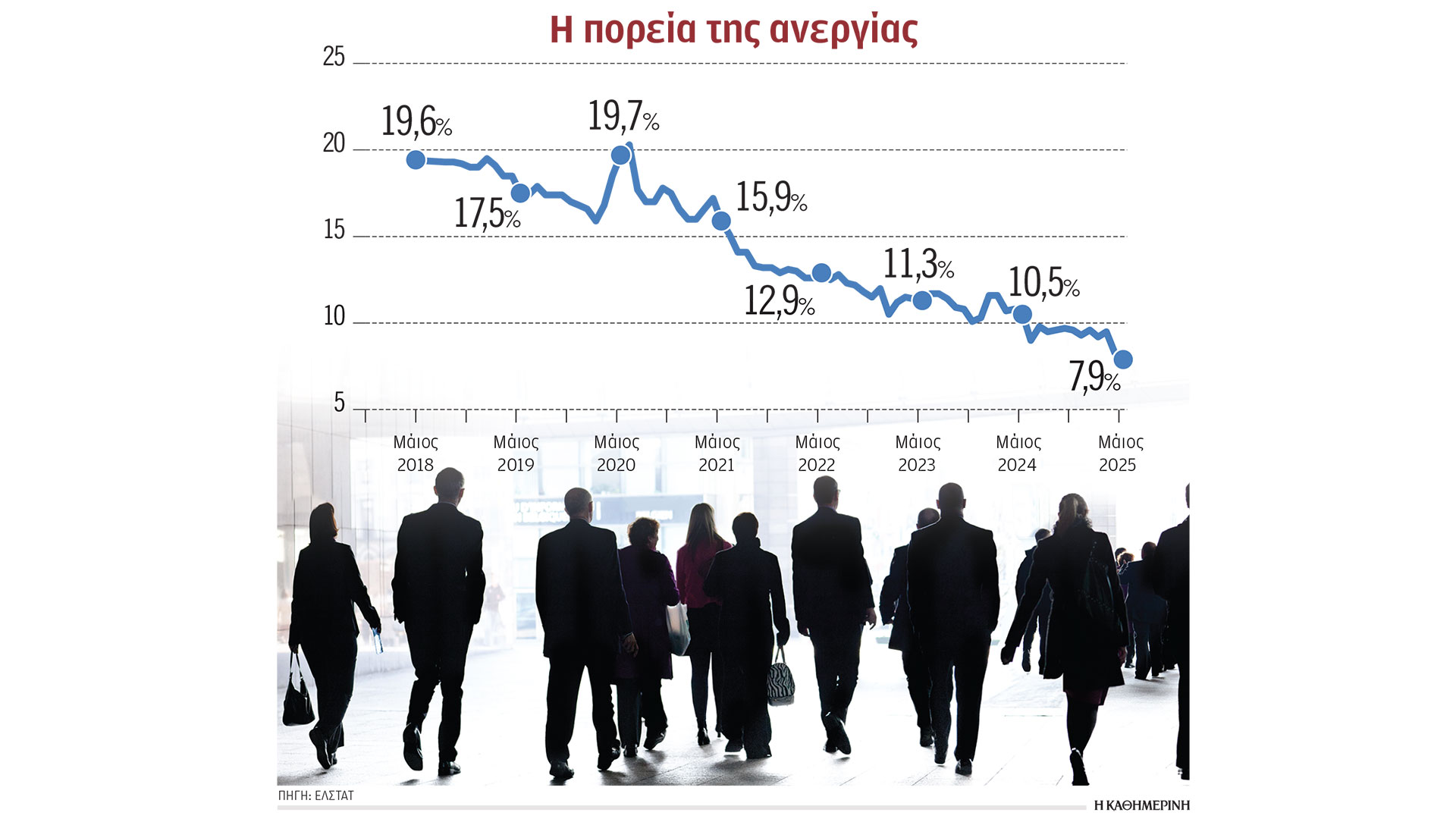 Αναλυτικά, σύμφωνα με την ΕΛΣΤΑΤ, το ποσοστό ανεργίας τον περασμένο Μάιο υποχώρησε στο 7,9%, σπάζοντας το φράγμα του 8% για πρώτη φορά μετά τον Νοέμβριο του 2008 (ήταν 7,7%). Σε σχέση με τον αμέσως προηγούμενο μήνα το ποσοστό μειώθηκε κατά 0,4 μονάδες (ήταν 8,3%), ενώ εάν η σύγκριση γίνει με τον αντίστοιχο μήνα του 2024, όταν η ανεργία είχε υπολογιστεί στο 10,5%, διαπιστώνεται μείωση κατά 2,6 ποσοστιαίες μονάδες.